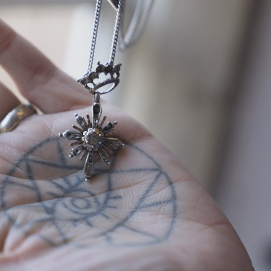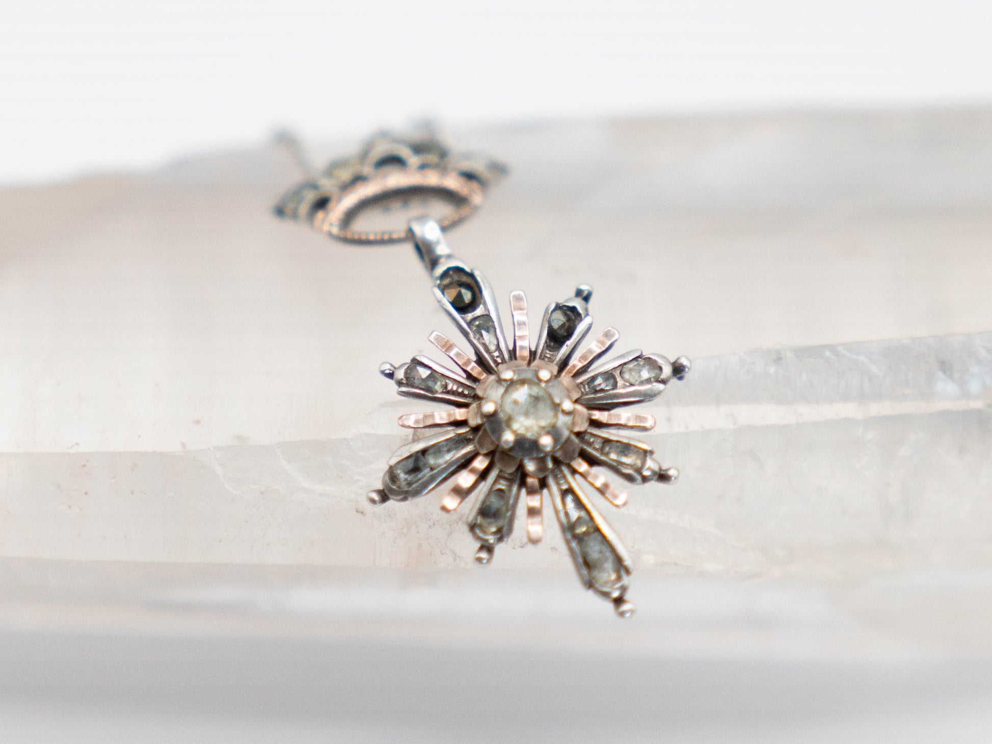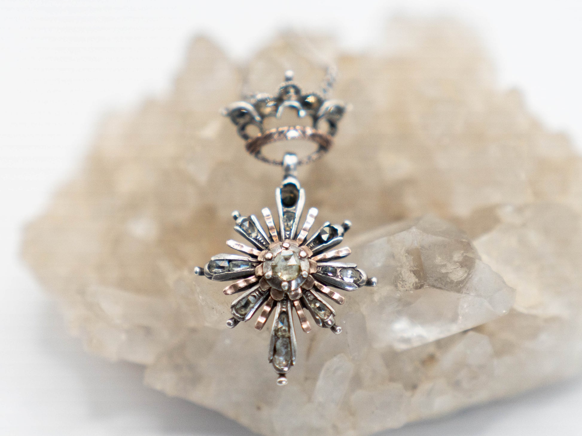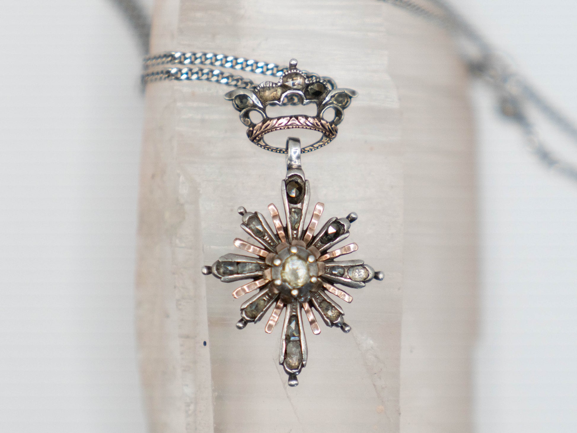 Rose gold and silver crown over star pendant on sterling silver chain.. Sourced from my favourite dealer in Islamic antiquities in the Grand Bazaar in Istanbul. With 13 old rose cut diamonds and 4 modern marquesites. The Rose cut was one of the first types of diamond cut, originating in the 16th Century. Rose cut diamonds were inspired by the spiral of petals in a rose bud. Instead of the intense sparkle of modern cuts, rose cut diamonds have a sensual shimmer, designed to look their best in candlelight. This is a unique pendant which has been transformed into a powerful love talisman and is the perfect spiritual ally to call in your highest love.