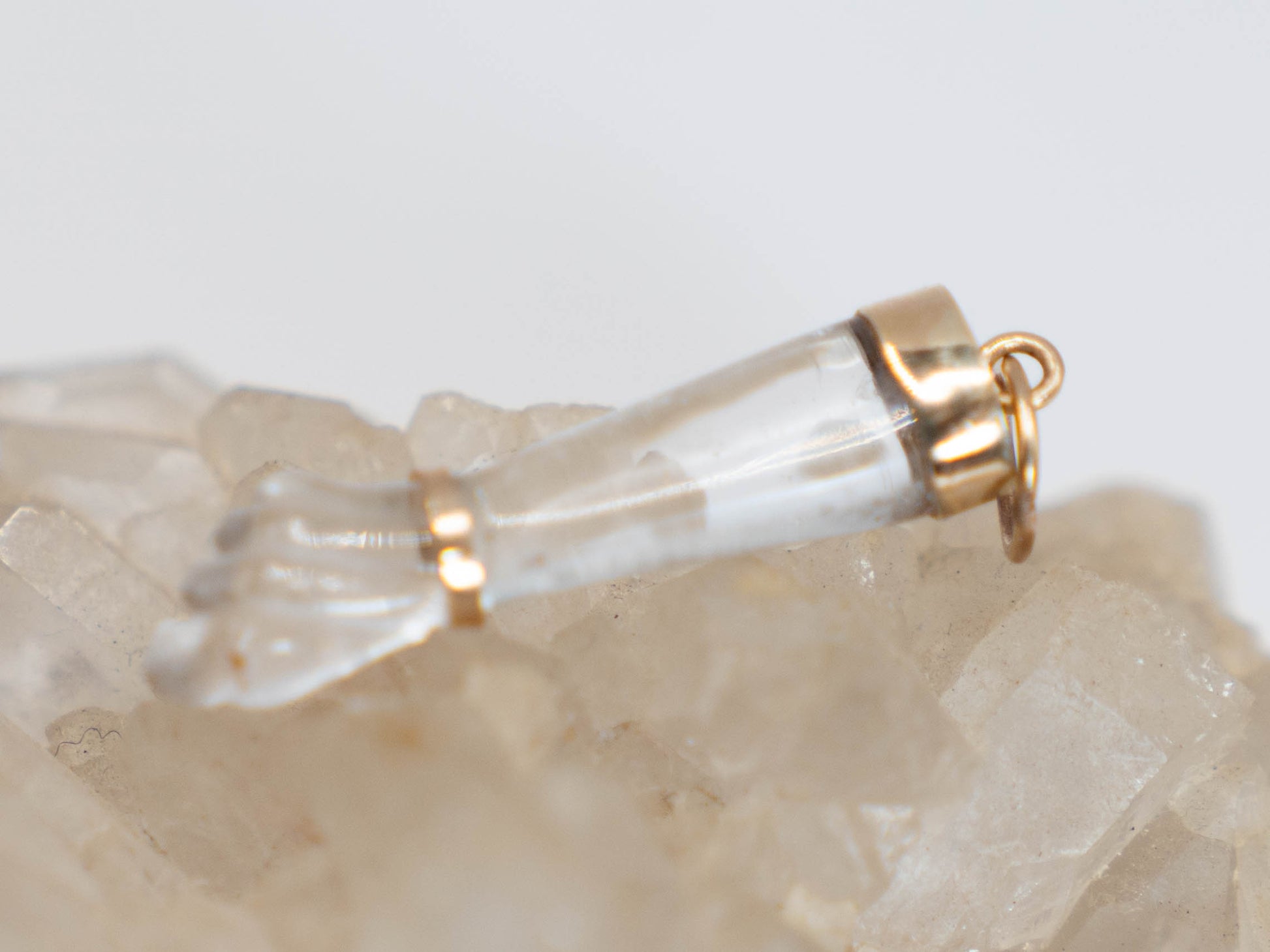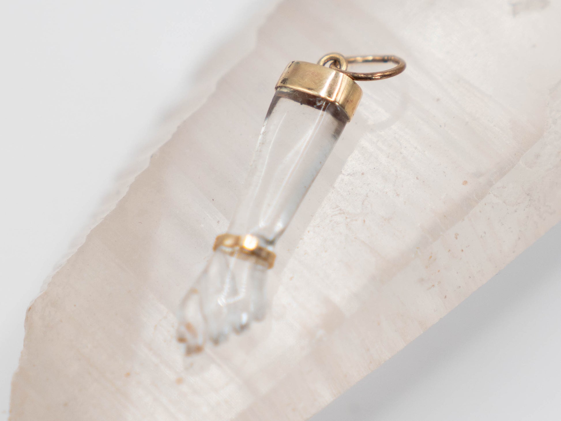 An antique Mano Figa, this clear quartz crystal piece takes the shape of the closed hand and fist of power, and this talisman packs a punch… literally. The closed fist is a universal sign of power, determination, and the will to protect oneself. The delicacy of the gold bracelet reminds us that protection doesn't come from hardness alone. Helping to cultivate inner clarity and awareness for its owner, this antique mano figa offers support and guidance, steering toxic influences away while reminding you to focus and hold on to the positive. Prepare to embrace your strength with this remarkable talisman.