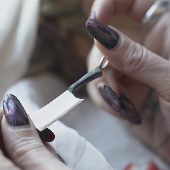 Large Cleaver. Nothing says ‘Don’t mess with me’ like a knife amulet - and this cleaver makes a particularly strong statement! Even before its intentional and ritual transformation into a protection talisman this knife gave powerful protective energy. This ritual knife brings the energetic gifts of power and control: historically, owning a knife signified a certain level of power. Traditionally knives also symbolize protection from evil spirits or ill fortune, as well as the courage to overcome challenges. The blade represents the ability to cut and separate, which can be a metaphor for breaking ties or making difficult choices. The perfect magical ally for anyone who is at a stage in their life where they need some extra strength and protection