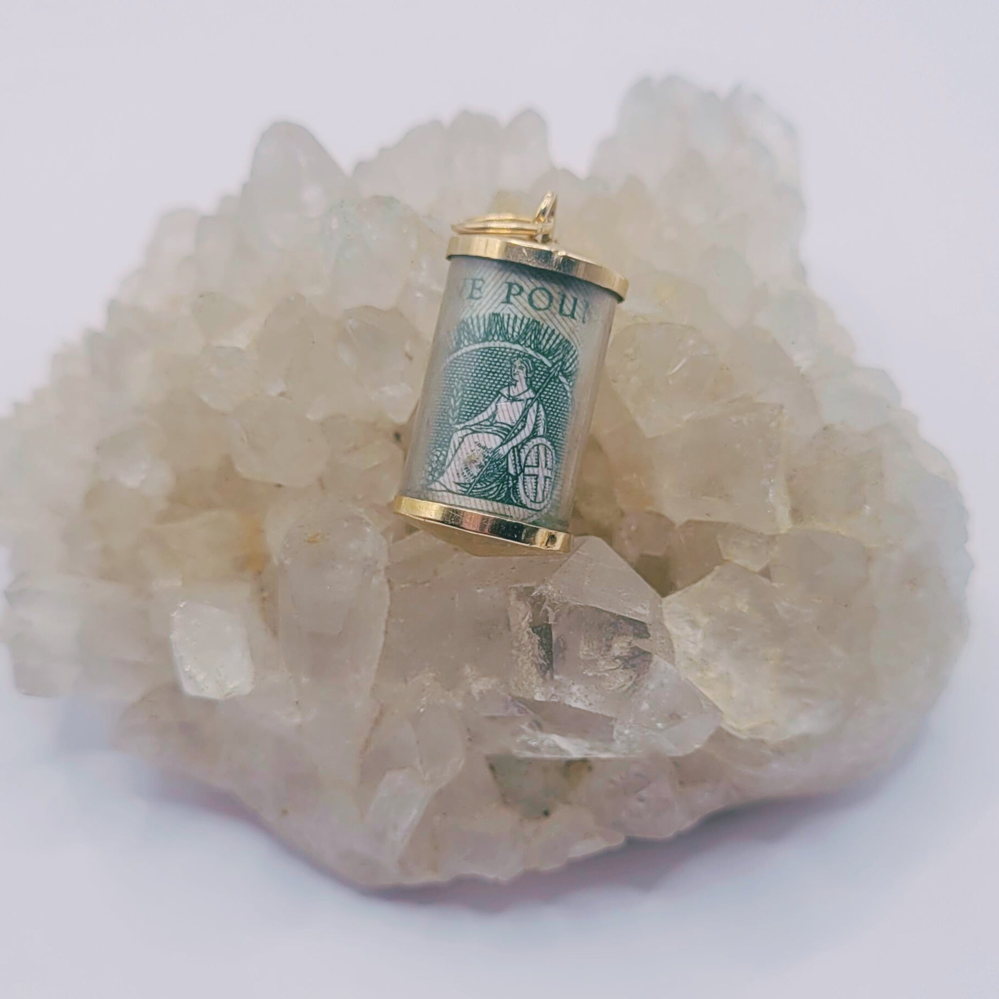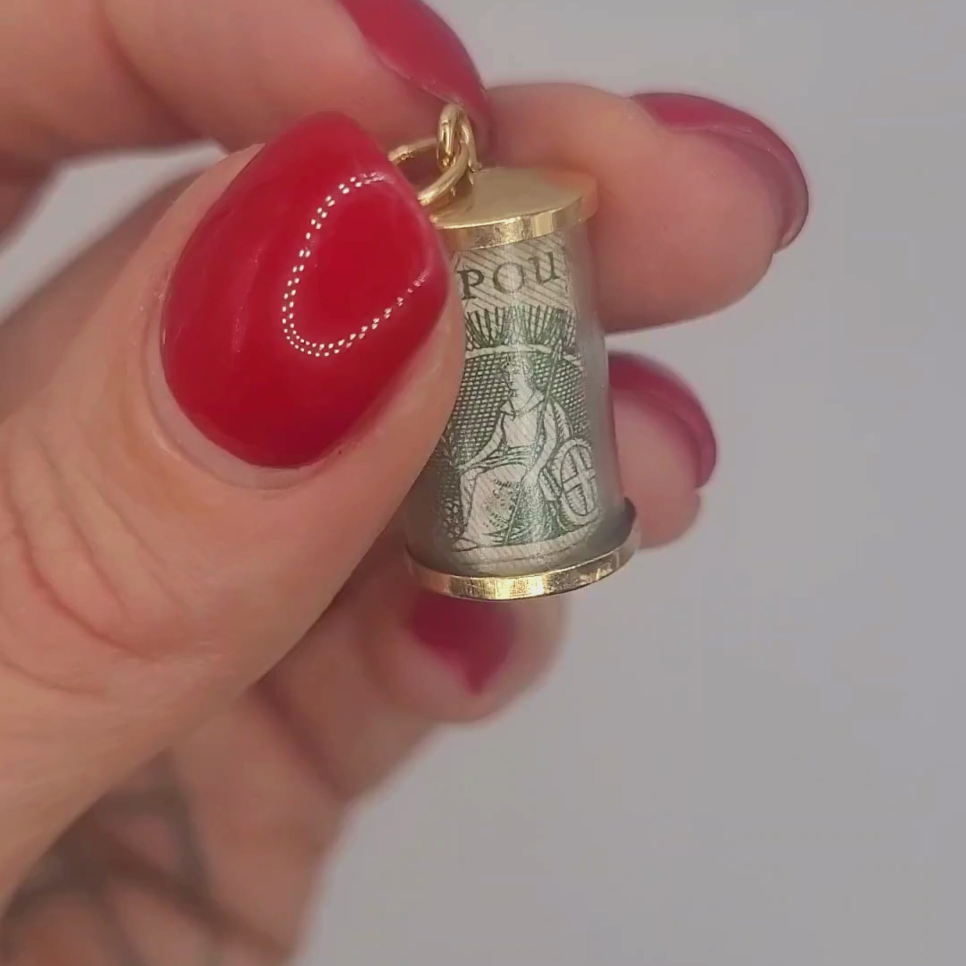 This is a vintage genuine 1 pound British note inside a cylindrical 9ct gold case. Pieces like the one used to make this talisman were carried by women as 'emergency money'. Carrying the charm meant that one was never without money. This energy of always having money is a powerful magickal charge, and makes these money talismans extremely effective amulets on their own, even before the intentional and ritual transformation into a money drawing talisman.