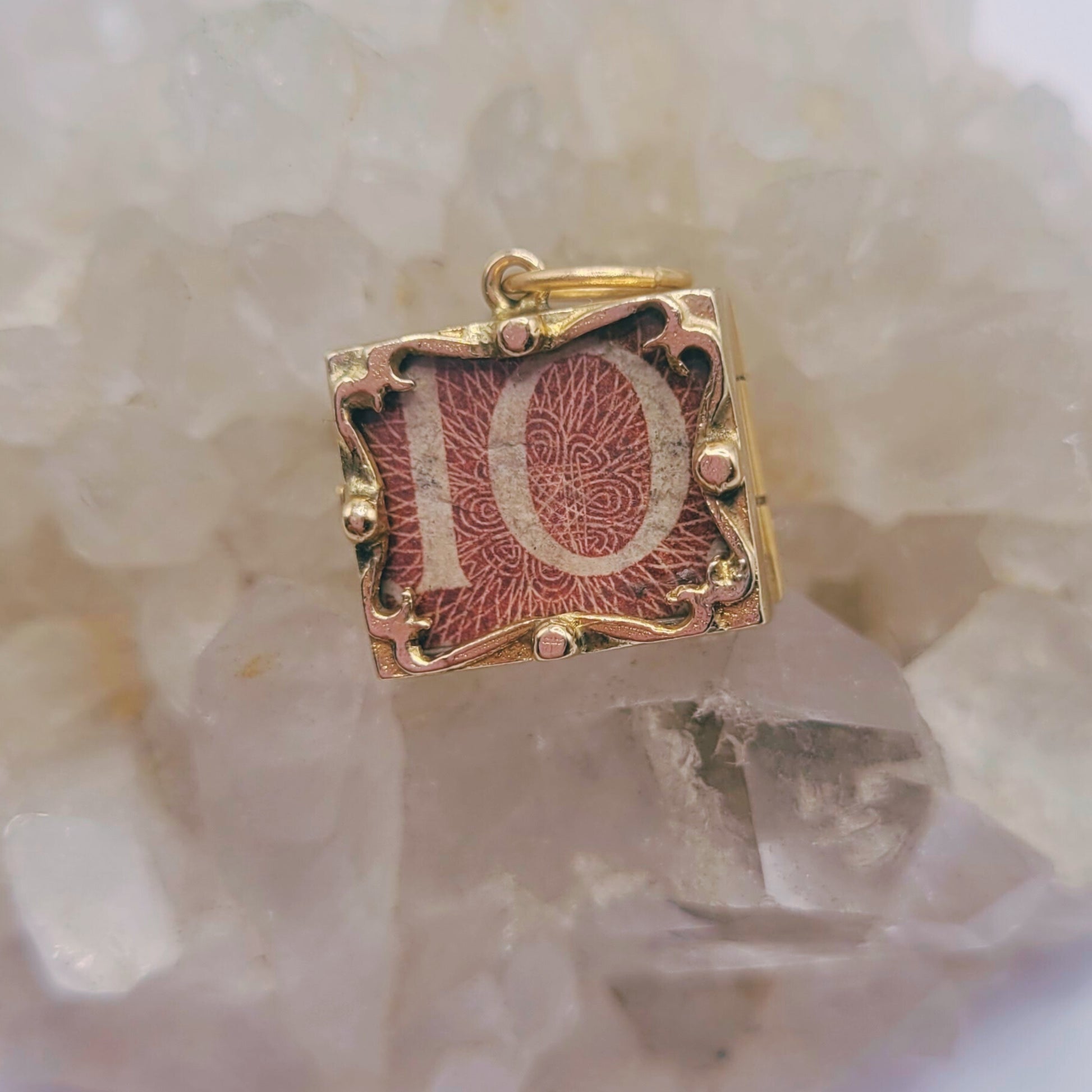 This is a vintage genuine 10 Shilling British note inside an ornate 9ct gold case. You can open the back of this talisman up to access the note (we don’t advise you do this; speaking from experience, its impossible to get it back inside!). We have never seen a piece like this before. Pieces like the one used to make this talisman were carried by women as 'emergency money'. Carrying it meant that one was never without money. This energy of always having money is a powerful magickal charge, and makes these money talismans extremely effective amulets on their own, even before the intentional and ritual transformation into a money drawing talisman.