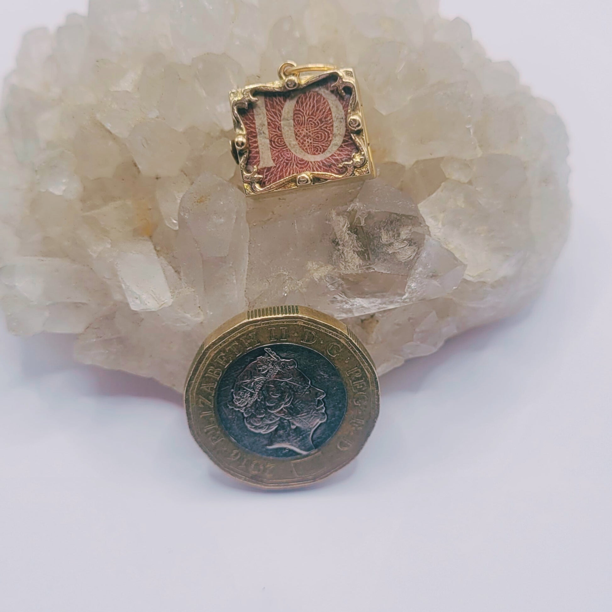 The charm this talisman is made from dates from the 1960s. Between the time this ten shilling note was sealed into the charm and now, British currency went through decimalisation. Shillings were removed as currency and are now rare.