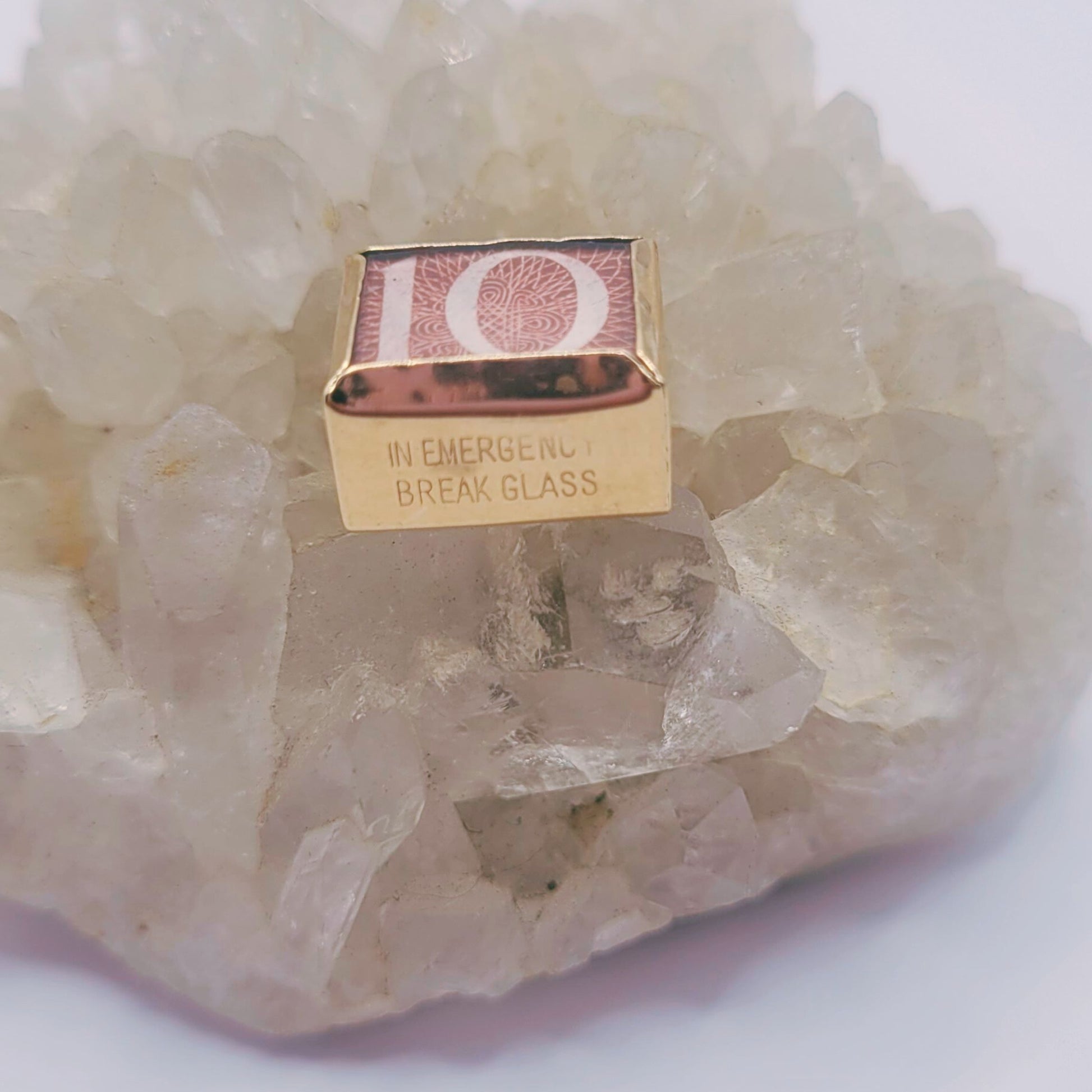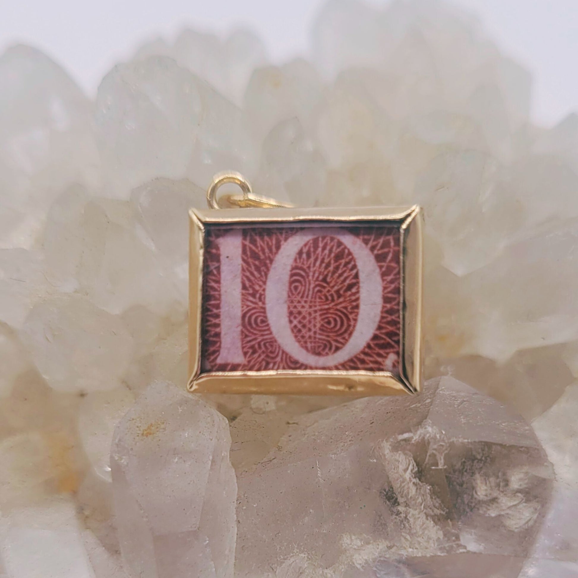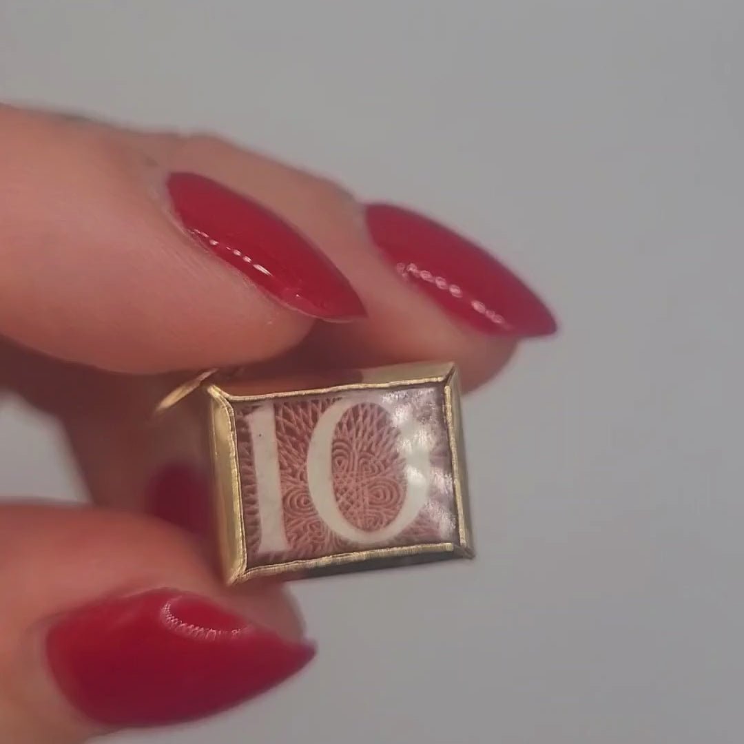 The charm this talisman is made from dates from the 1960s. Between the time this ten shilling note was sealed into the charm and now, British currency went through decimalisation. Shillings were removed as currency and are now rare.