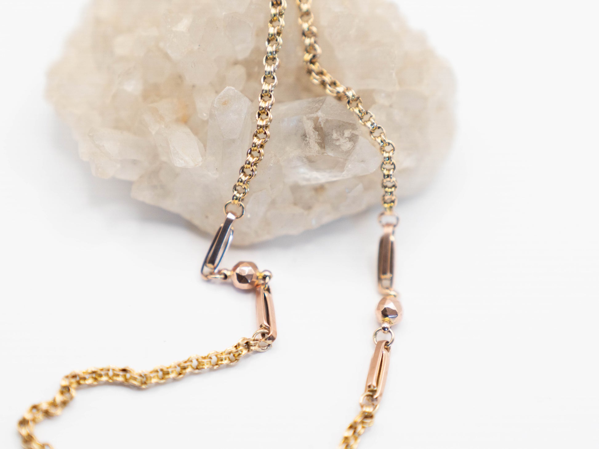 A very old (circa 1850s) and delicate piece, this is made from an antique long guard chain. This piece has been transformed into a money talisman so that you can wear the energy of entitlement to wealth and money continuously.