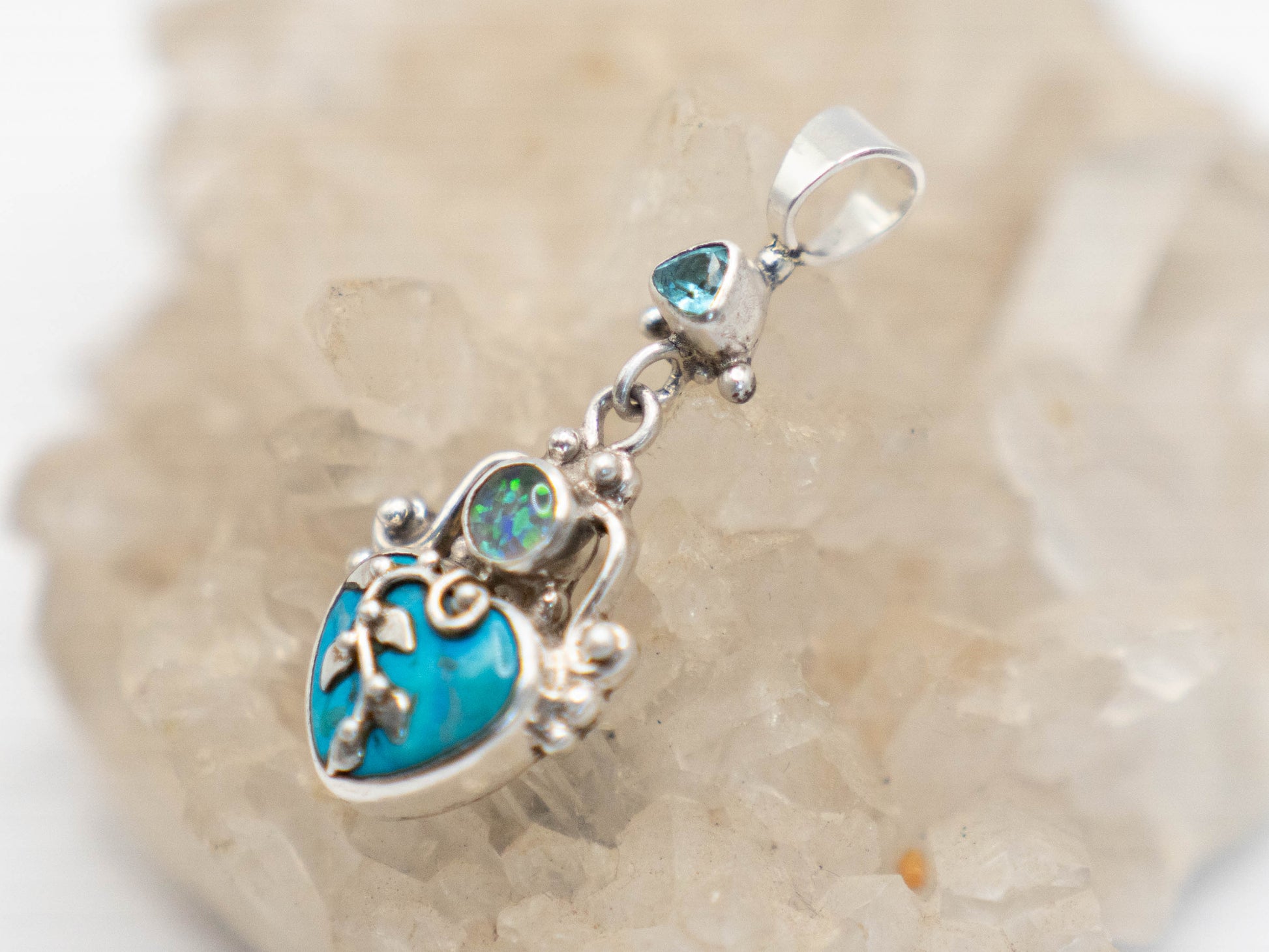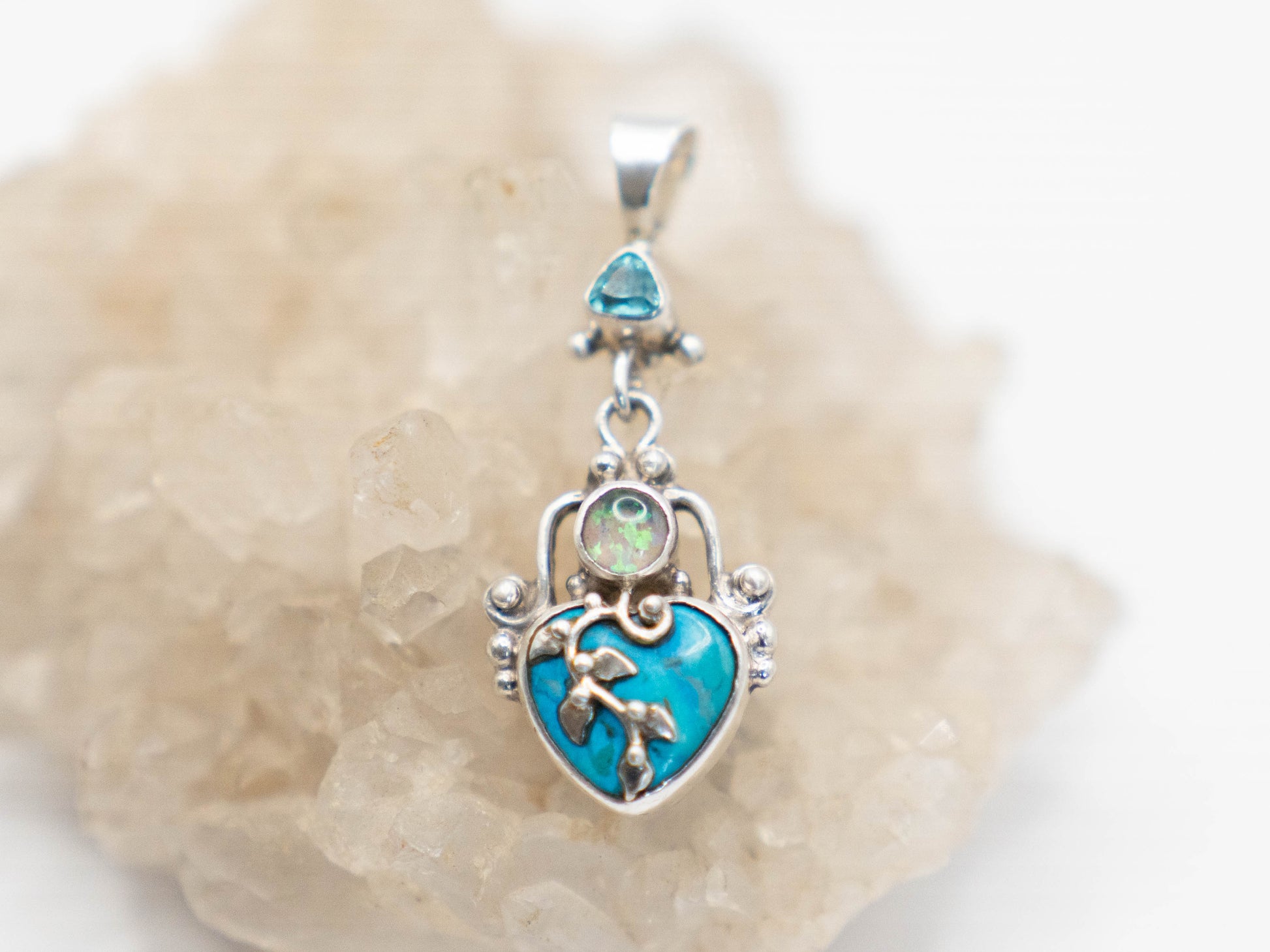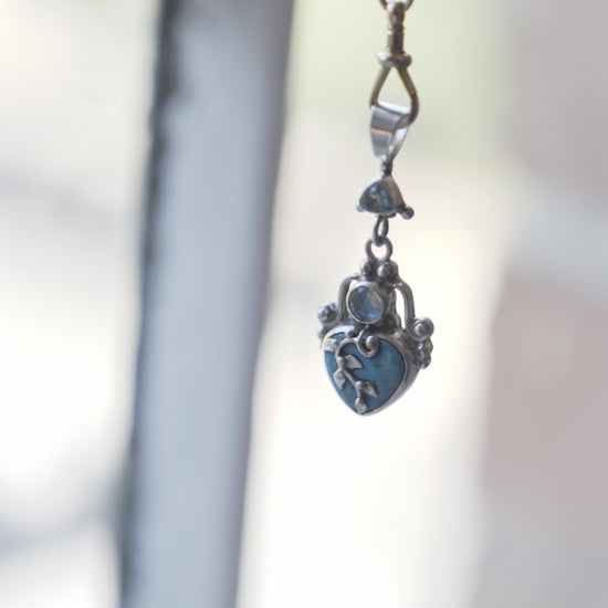 This fire opal, aquamarine and turquoise pendant with a fruiting vine growing over the central heart is a special piece. This is beautiful symbol of abundant love has been transformed into a potent love talisman. The stones bring their own gifts: Fire opal brings passion, creativity and emotional strength, also associated with new beginnings and the energy to overcome feeling stuck; aquamarine brings courage, communication and protection; and turquoise brings healing and a connection with divinity. This is the spiritual ally for you if you want to attract expansive love relationships. If you have felt restricted or restrained in your relationships in the past (including your relationship with yourself and your vision for your own life), this is the talisman for you. With this magical being at your side it is time to completely turn things around and create a whole new era in your relationships of all kinds.