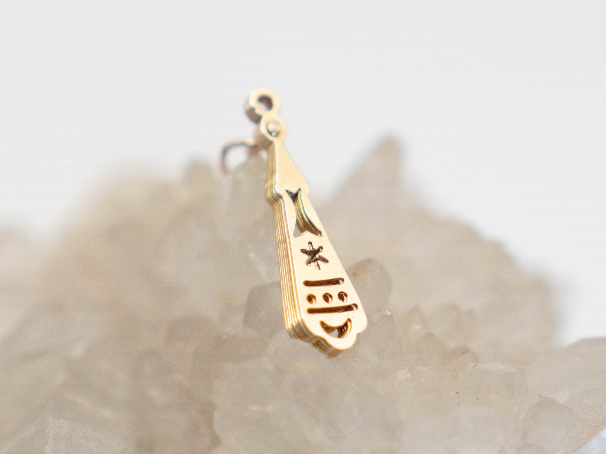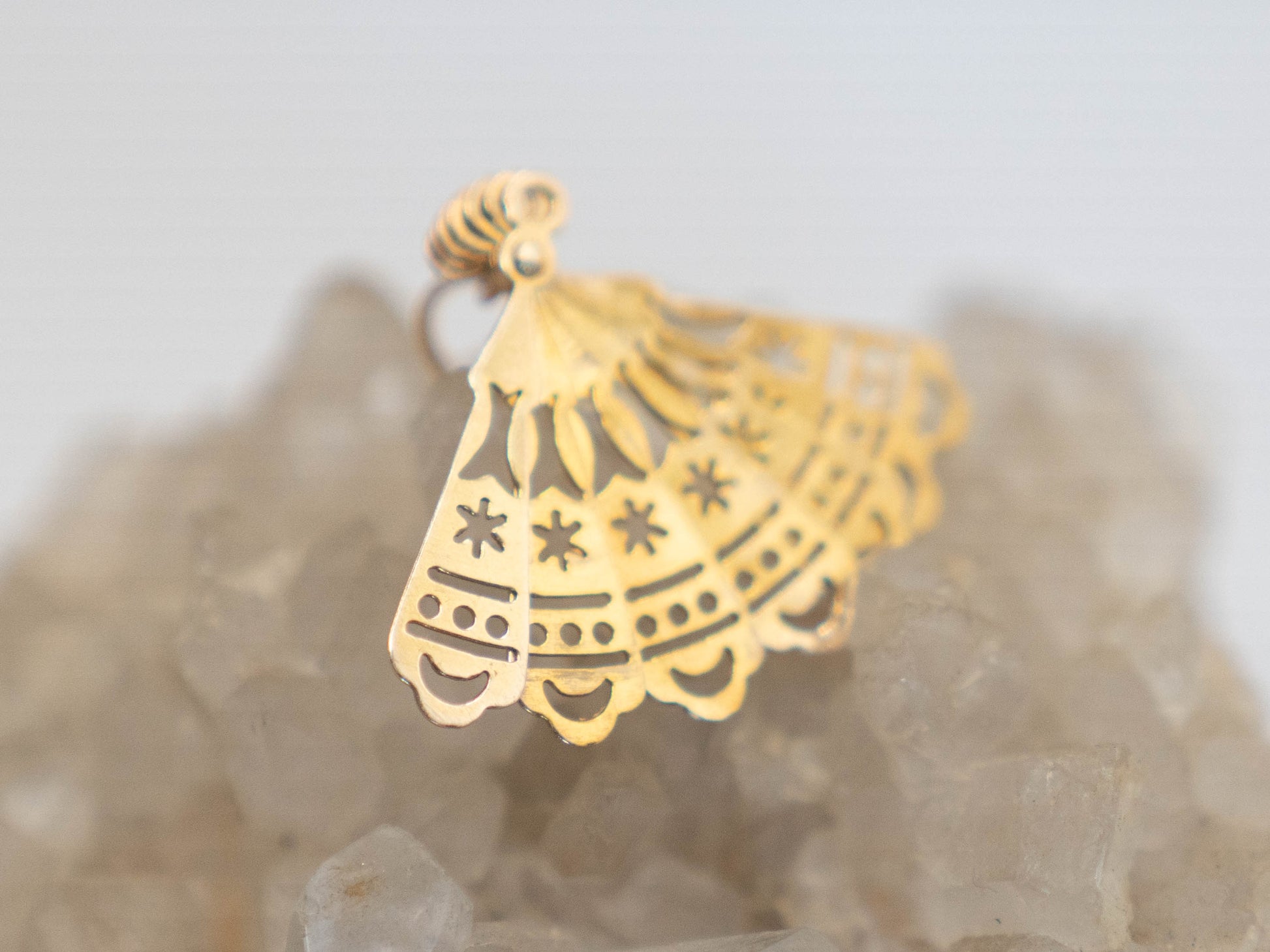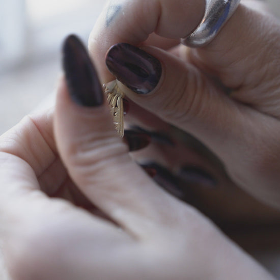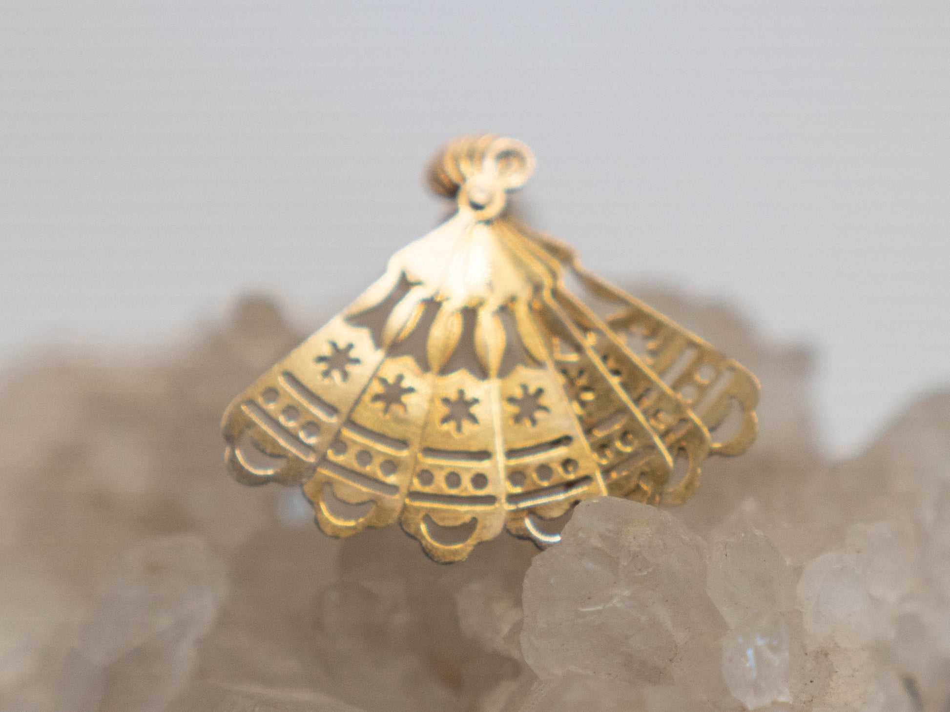 Fan made of 9c gold. The fan opens and closes and has a beautifully detailed pattern with stars and crescent moons. Historically fans were a symbol of status, sophistication and authority, stretching as far back as ancient Egypt. In Europe in the 18th and 19th centuries, a whole secret language of fans developed, where a fan's position and movement could communicate a coded message to others. Transformed into a love talisman, this magical being will help you to maintain your sovereignty in your relationships and ensure clear communication of your desires and boundaries.