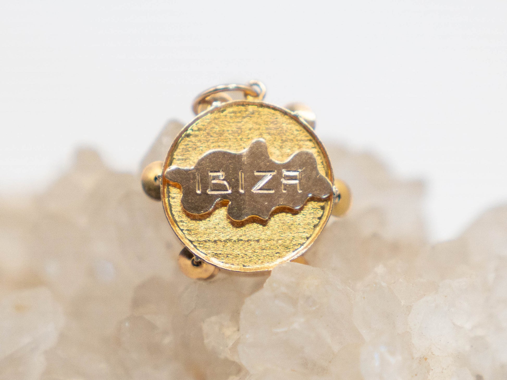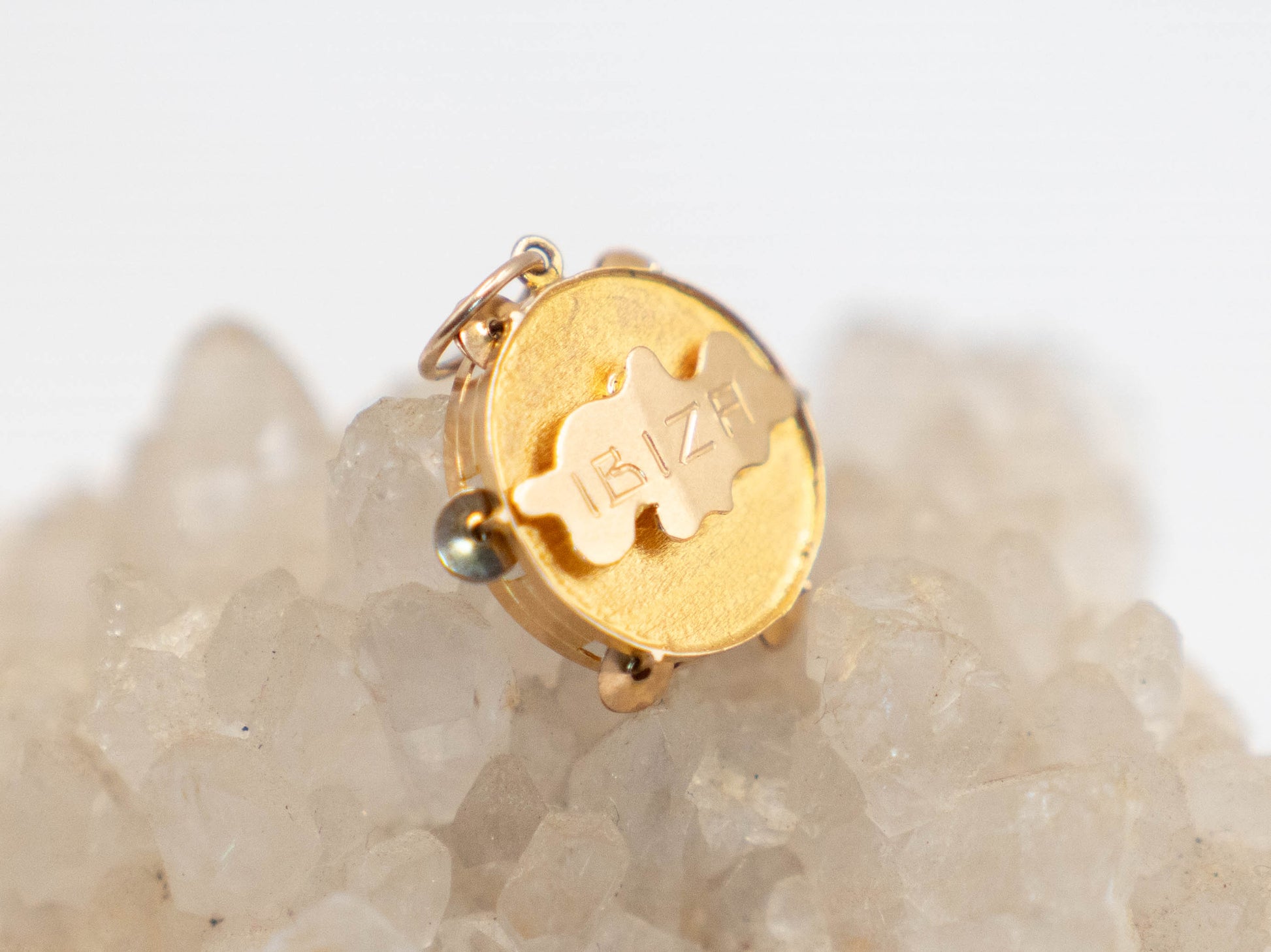 Gold Ibiza tambourine pendant. This joyful pendant brings with it all of the bohemian charm of the White Isle: from the hedonistic partying via the natural beauty of the cliffs and sun-drenched beaches to the spirituality of Es Vedra. Transformed into a powerful love talisman, this is the magical companion for you if you seek joyful free-spirited love relationships and a life that follows the beat of your own drum.