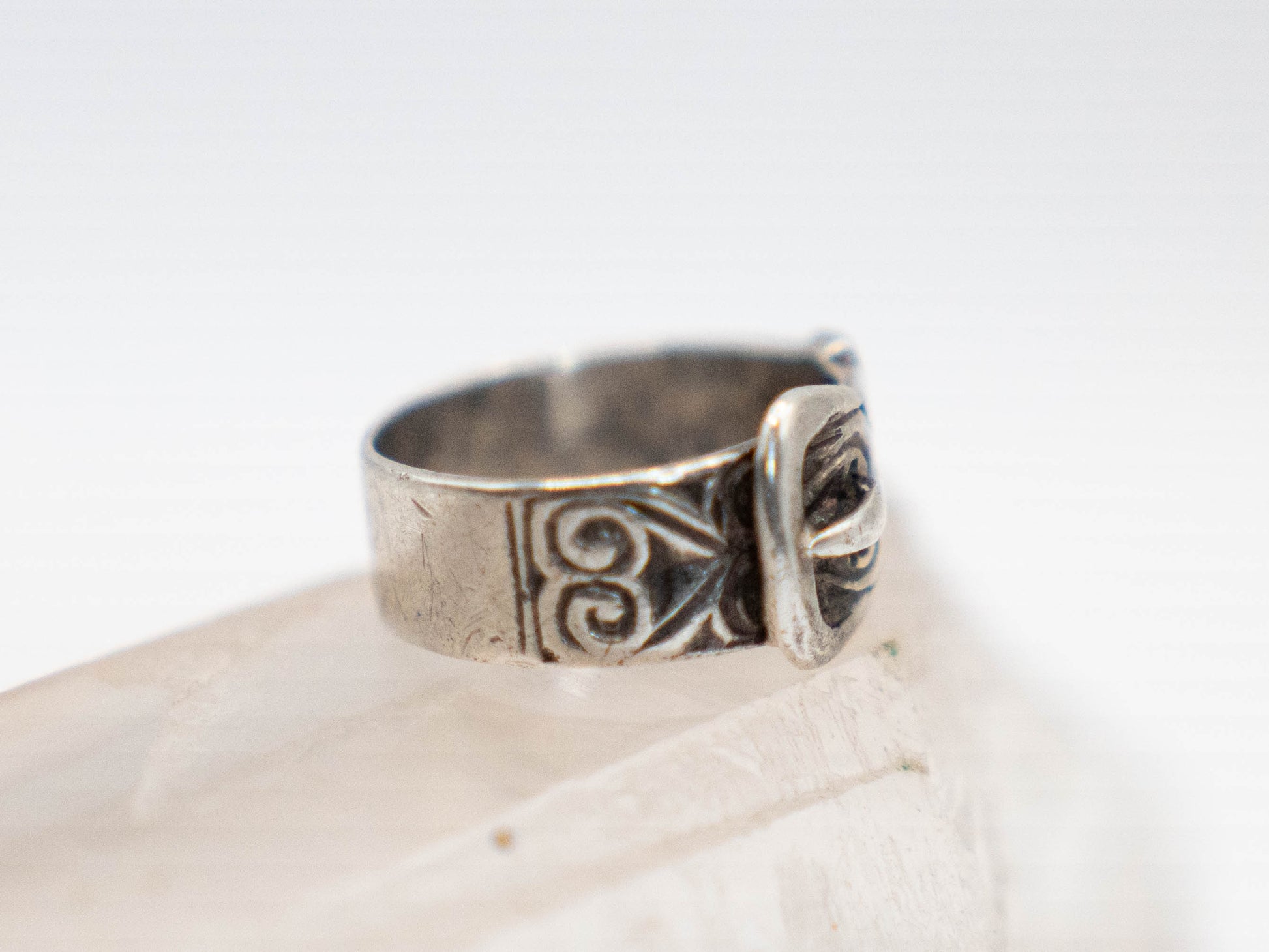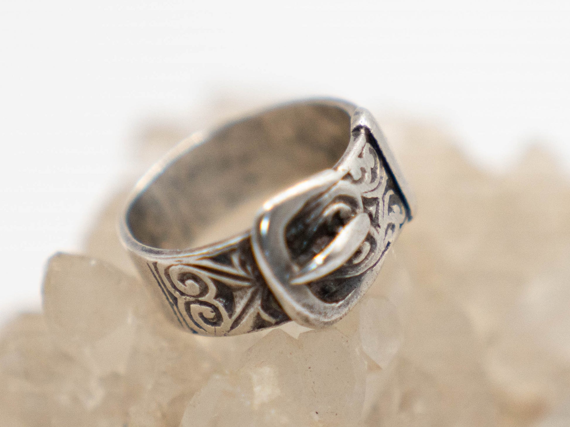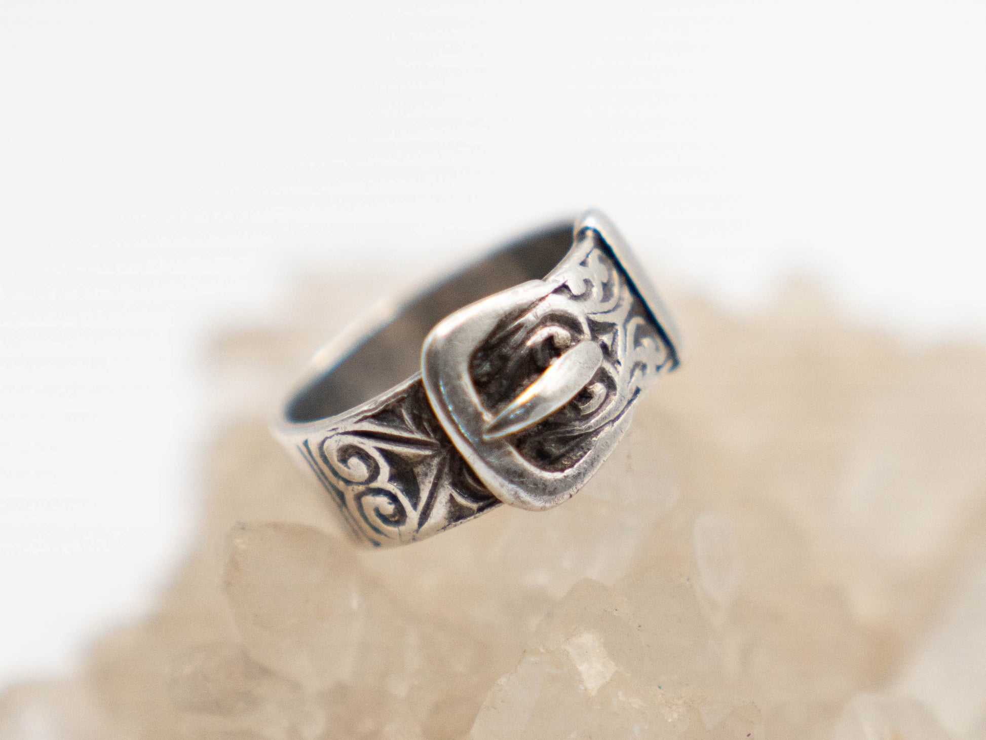 A beautiful silver Victorian belt ring. This piece has layers of powerful symbolism built into it. Rings have been a symbol of unending love for centuries, perhaps millennia! In addition, this specific design of a belt and buckle was a traditional symbol of eternity, loyalty, strength and protection, the qualities we need for love of the Self . The belt curves around and threads back onto itself, creating an eternal loop. This ring transformed into a powerful love talisman will encourage the wearer to feel true self love and act as a reminder of the same.