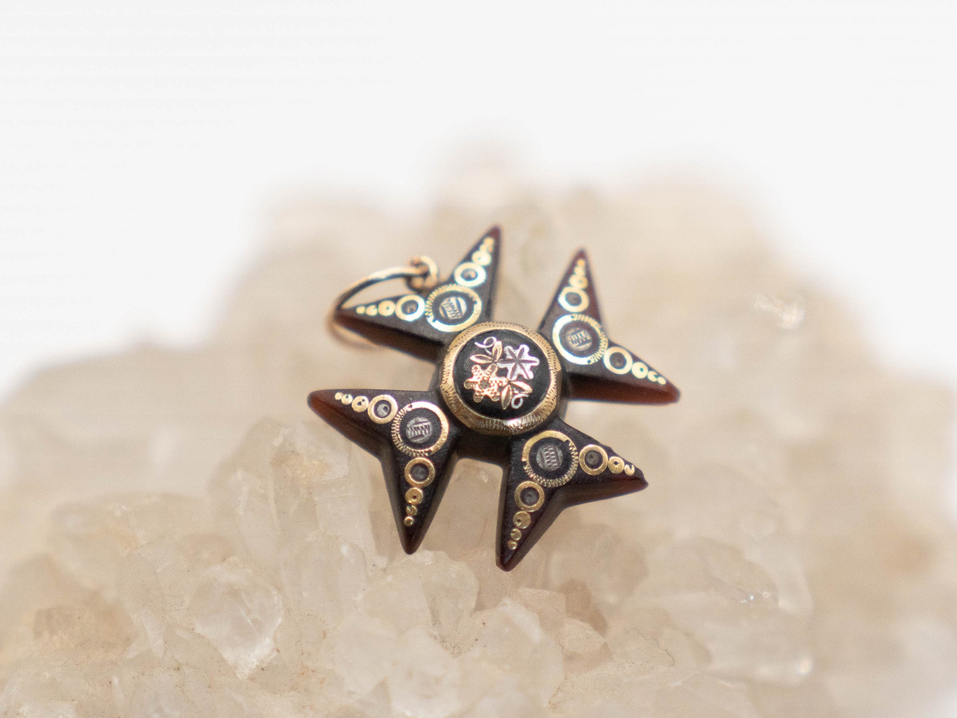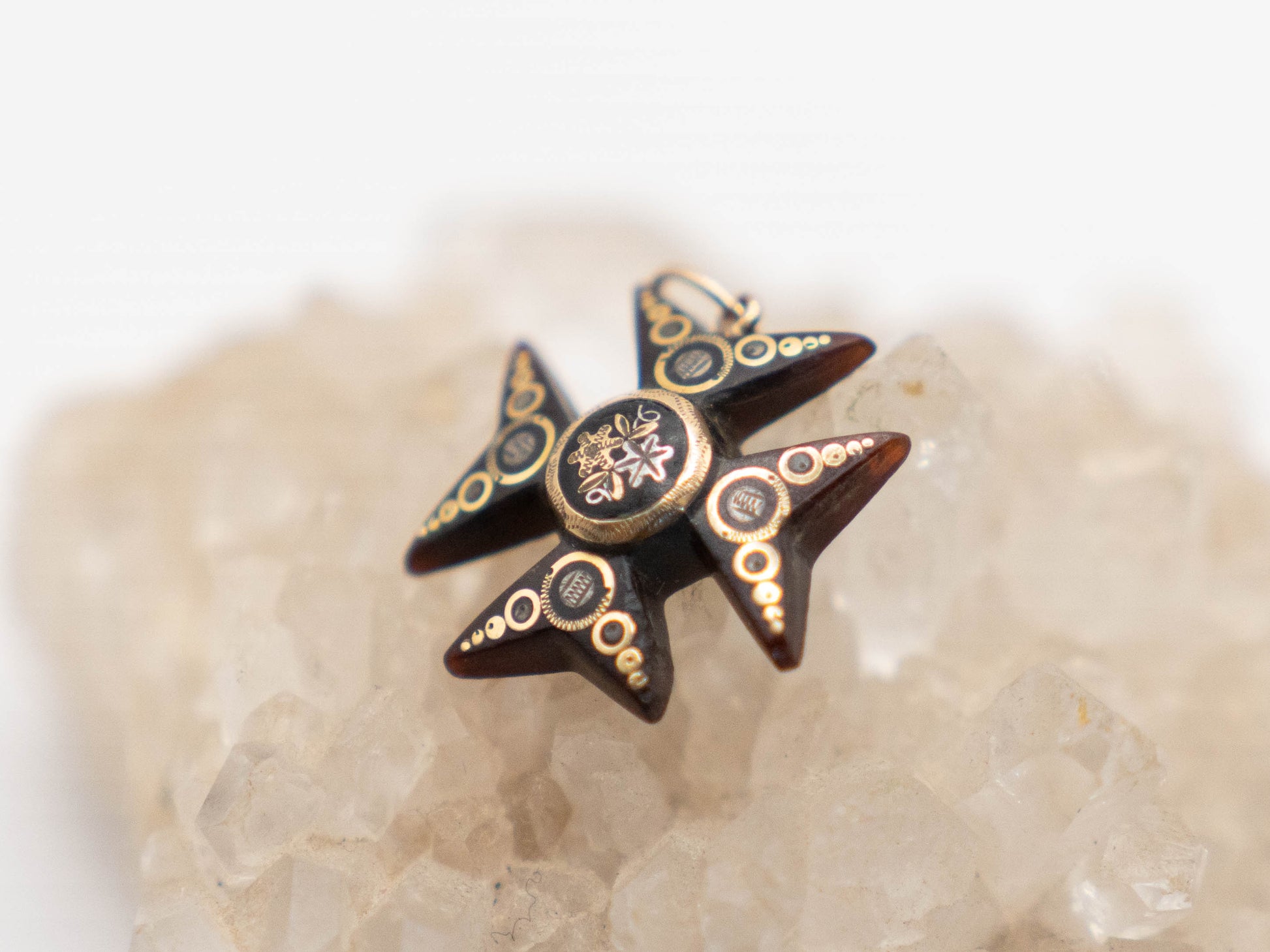 This antique tortoise shell piece inlaid with 14ct gold and silver cross is one of the pieces sourced from my favourite dealer in Islamic antiquities in the Grand Bazaar in Istanbul. Although the cross is now a symbol of Christianity, it has always been a powerful protective symbol beyond that religion, and is recognised as a sign of harnessing the universal force of good, for many. The Maltese Cross - a star with eight points is a symbol of the Eight Beatitudes; blessings described by the prophet Jesus. These blessings are meant to echo the highest ideal of spiritual love and compassion; emphasising love and humility over control and force. This antique tortoiseshell cross transformed into a potent love talisman by your side, you will have the power to invite in such a love. This magical being will be an ally to anyone who centers compassion and justice in their lives.