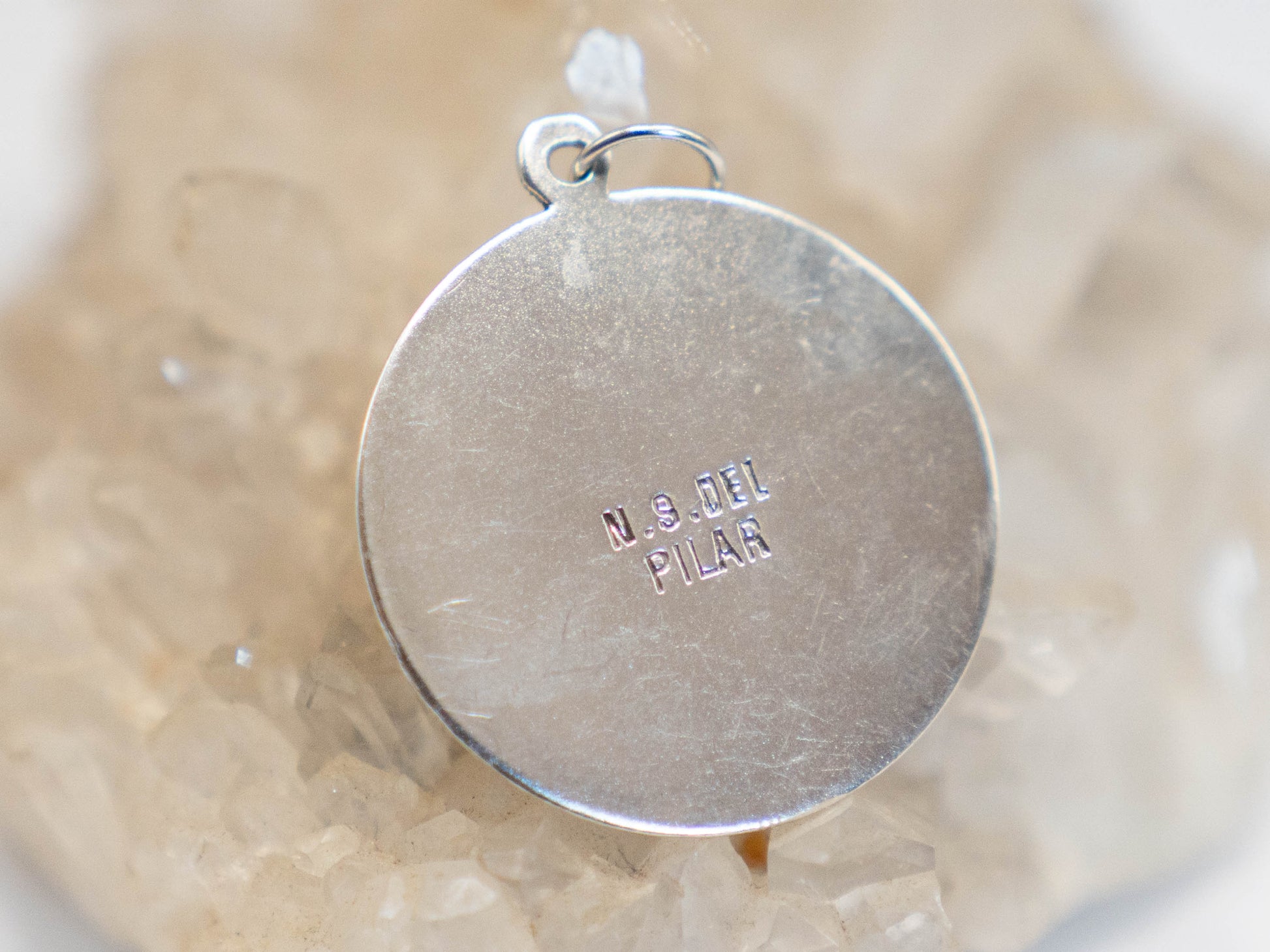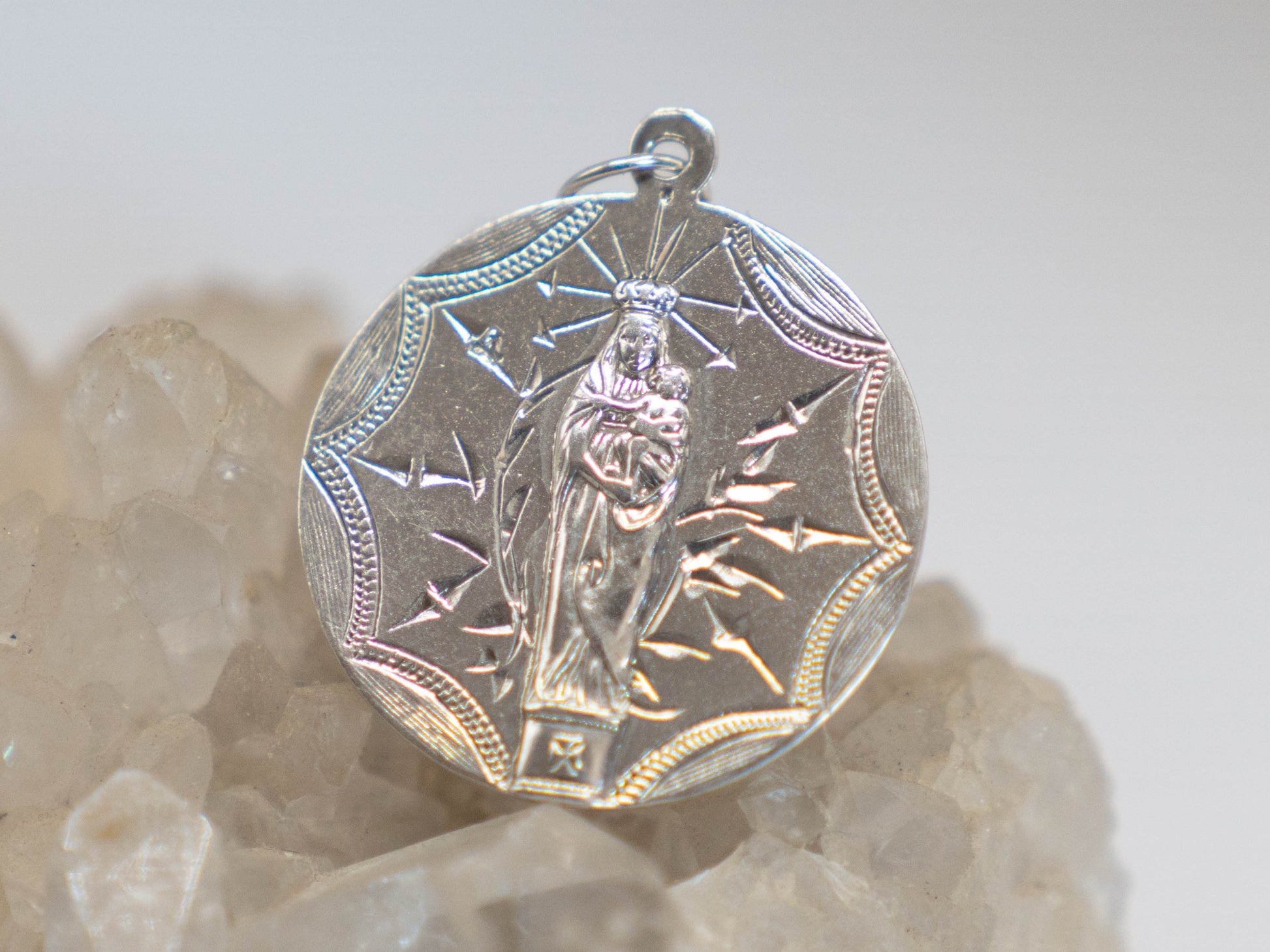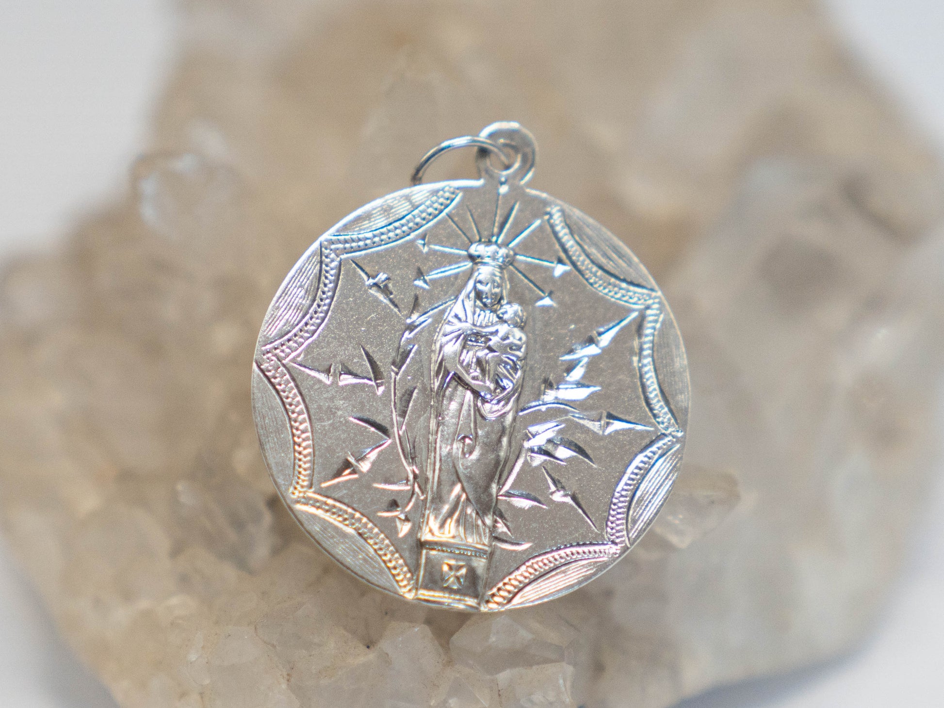 The Black Madonna of Montserrat is venerated on an ancient hill above Barcelona, the site of an ancient temple to Venus. For thousands of years the Divine Feminine has been venerated on this site, and this statue represents not only the Christian incarnation of such energy but all manifestations of the powerful protection of women. Remain seen, loved, and protected with this talisman. The Divine love of the Virgin Mary is unmatched and unwavering. Her many facets provide elevated, multidimensional protection, allowing you to journey through the unknown with peace of mind. Engraved in this silver talisman, we see her cradling her baby, waiting to heal and protect the inner child that lives within you.