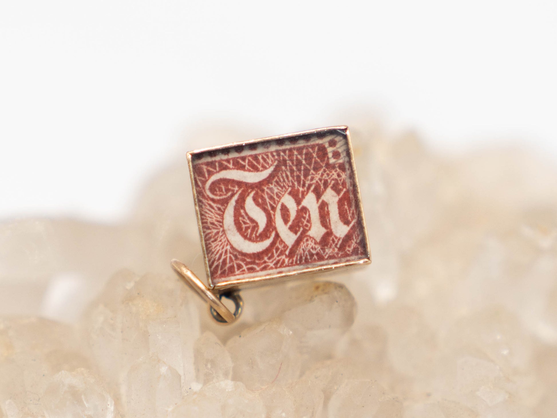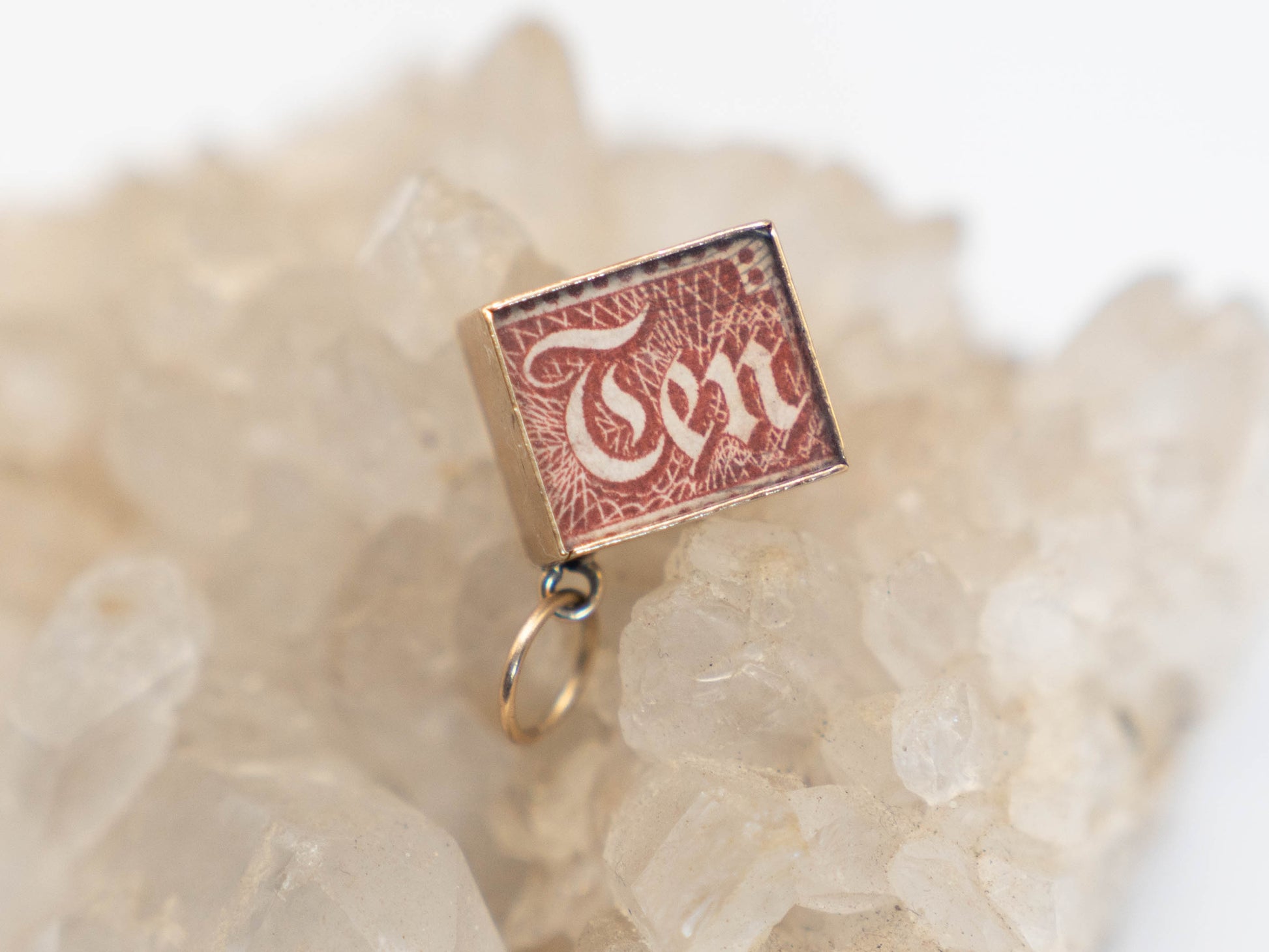 The charm this talisman is made from dates from the 1960s. Between the time this ten shilling note was sealed into the charm and now, British currency went through decimalisation. Shillings were removed as currency and are now rare.