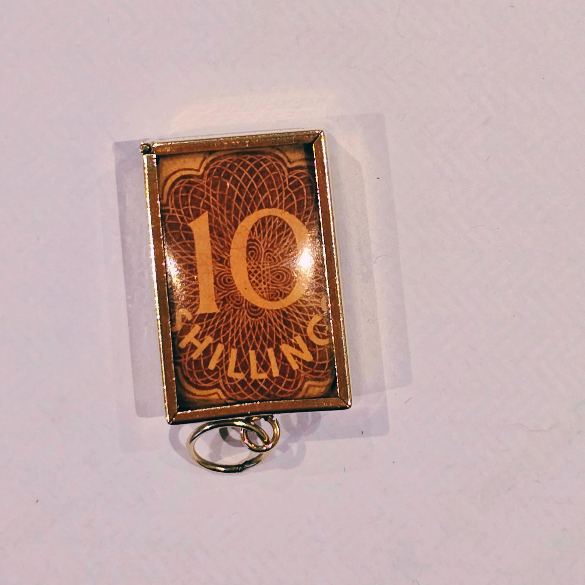 This is a vintage genuine British Ten Shilling note inside a 9ct gold double-sided case. These double-sided charms are extremely rare. Be prepared to have people stop and ask you where you got your talisman from!