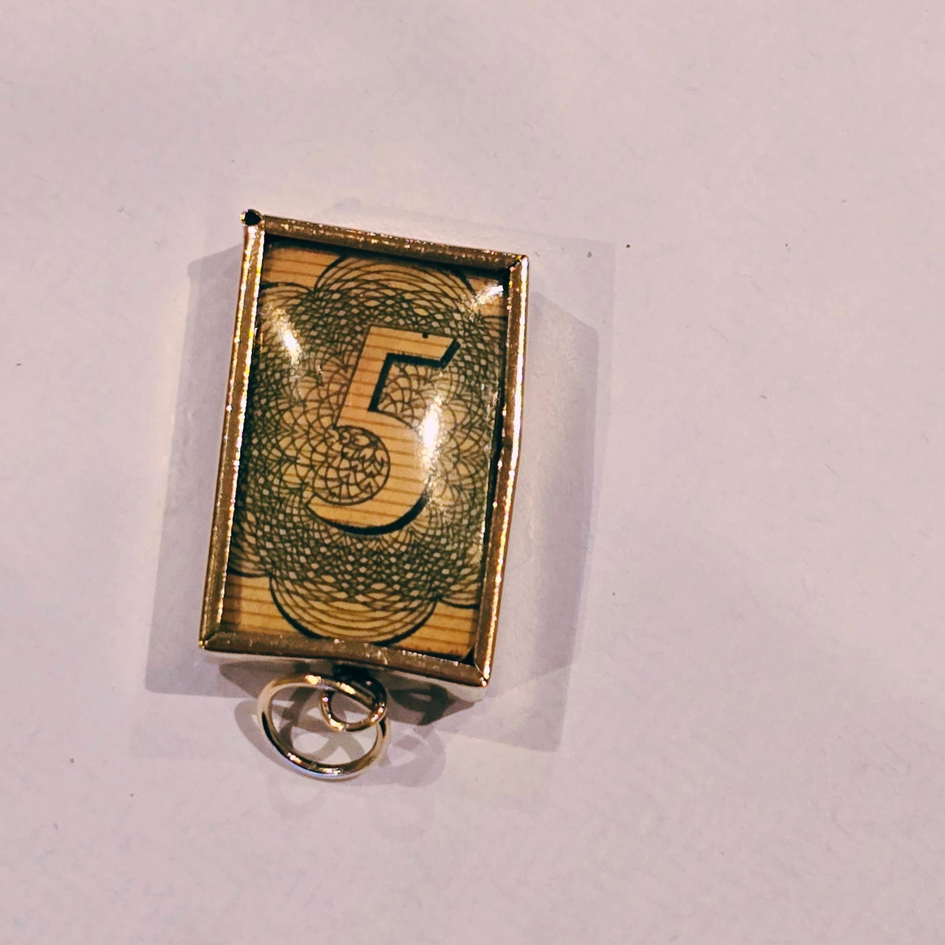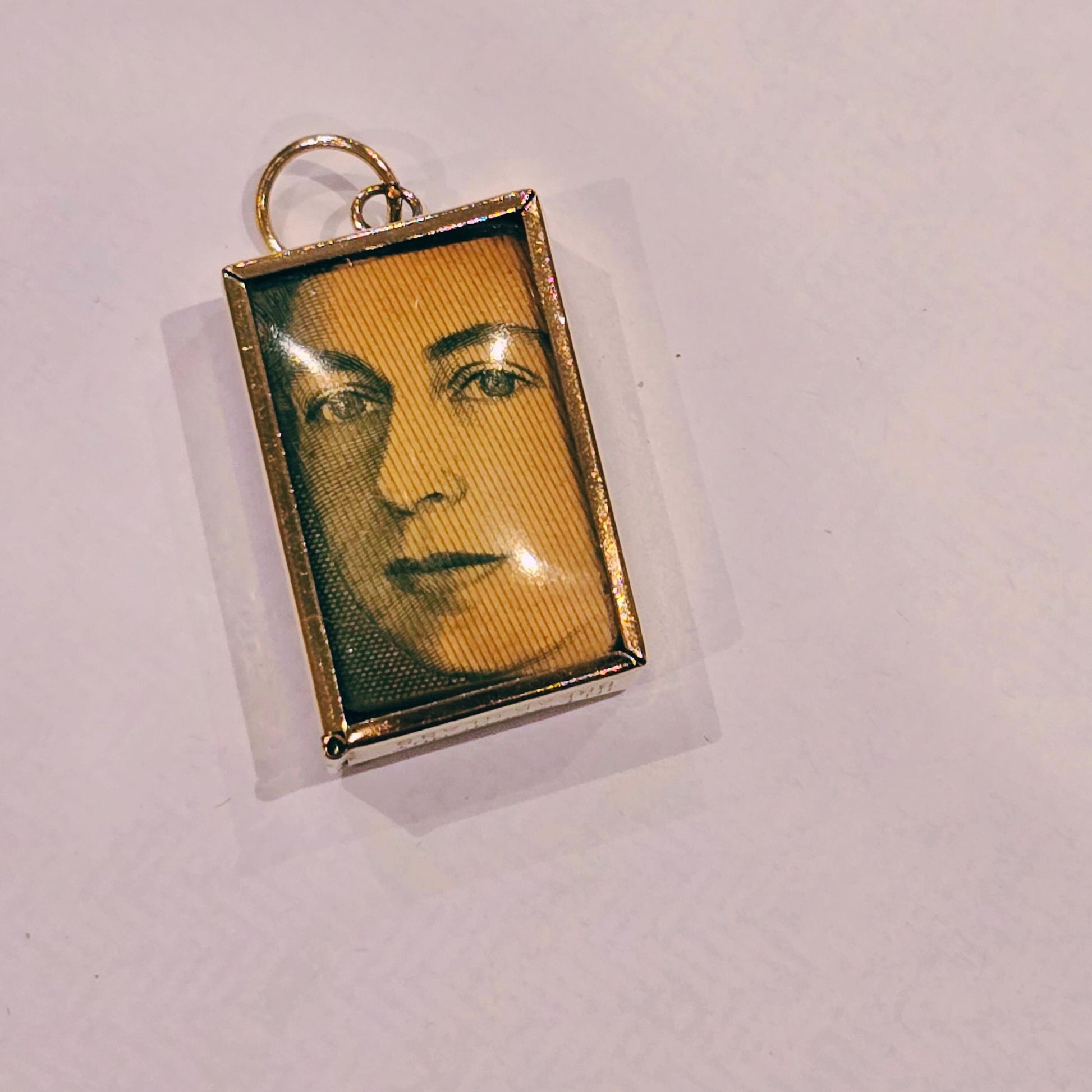 This is a vintage genuine British Five Pound note inside a 9ct gold double-sided case. These double-sided charms are extremely rare. Be prepared to have people stop and ask you where you got your talisman from!