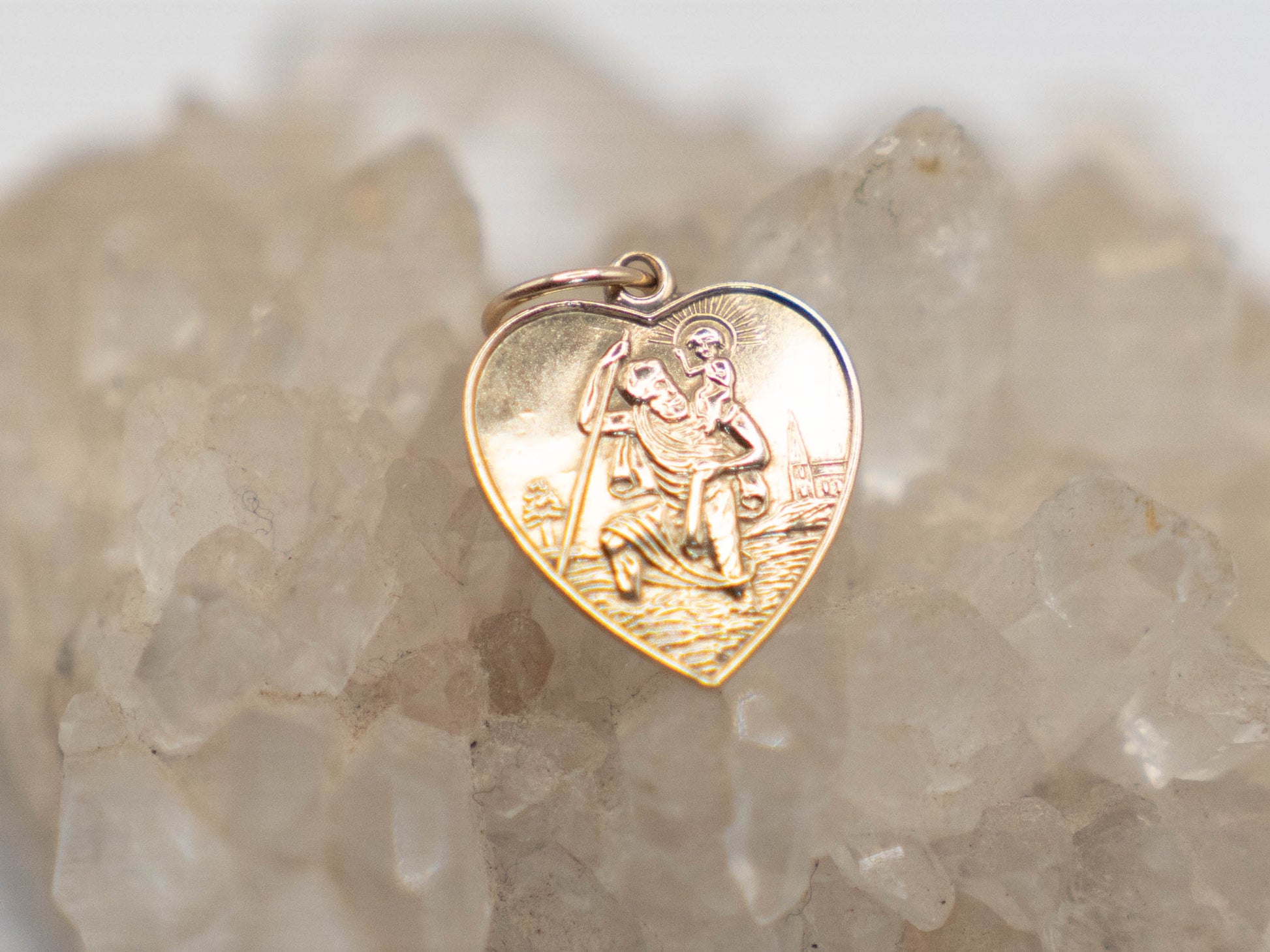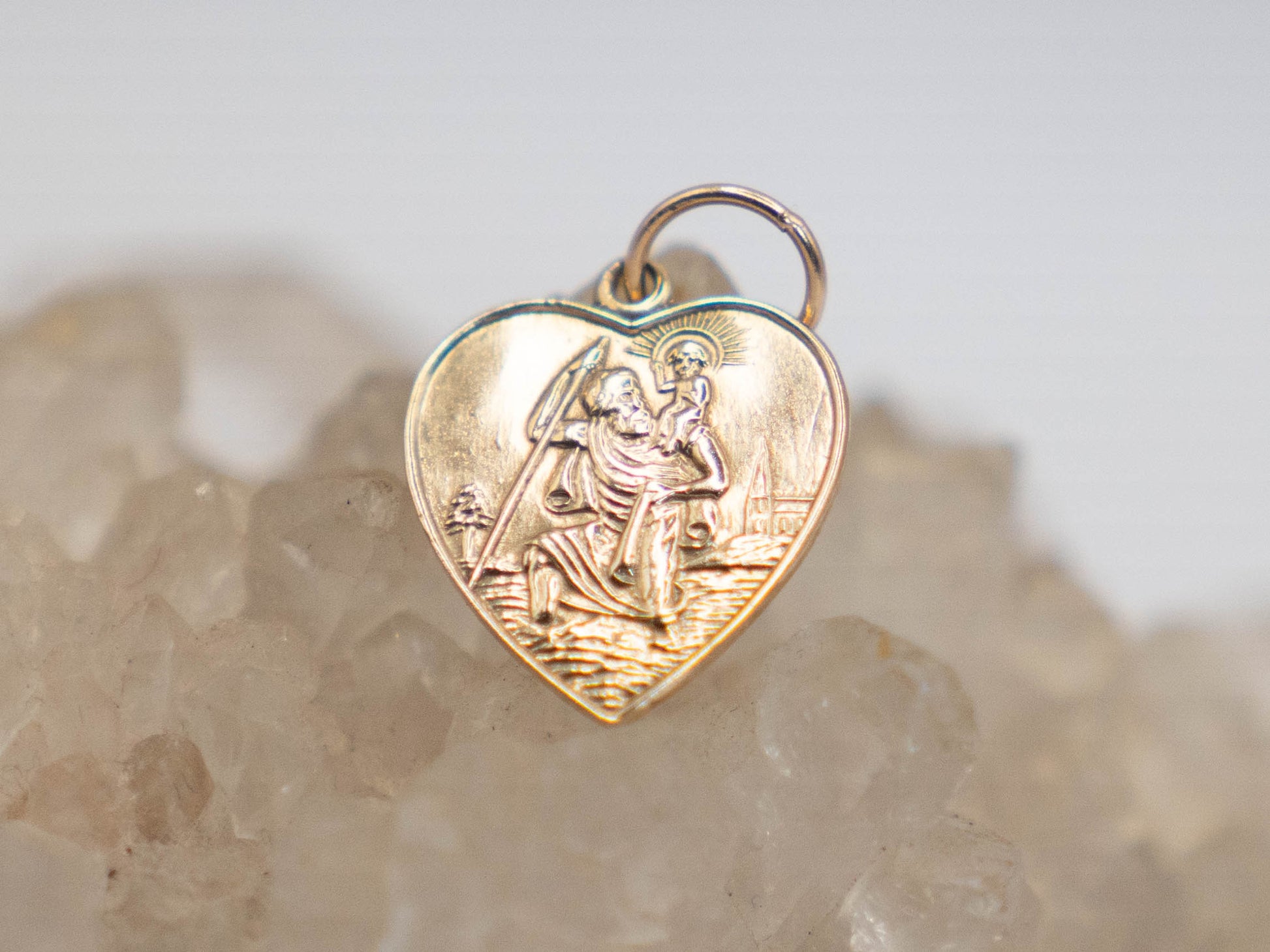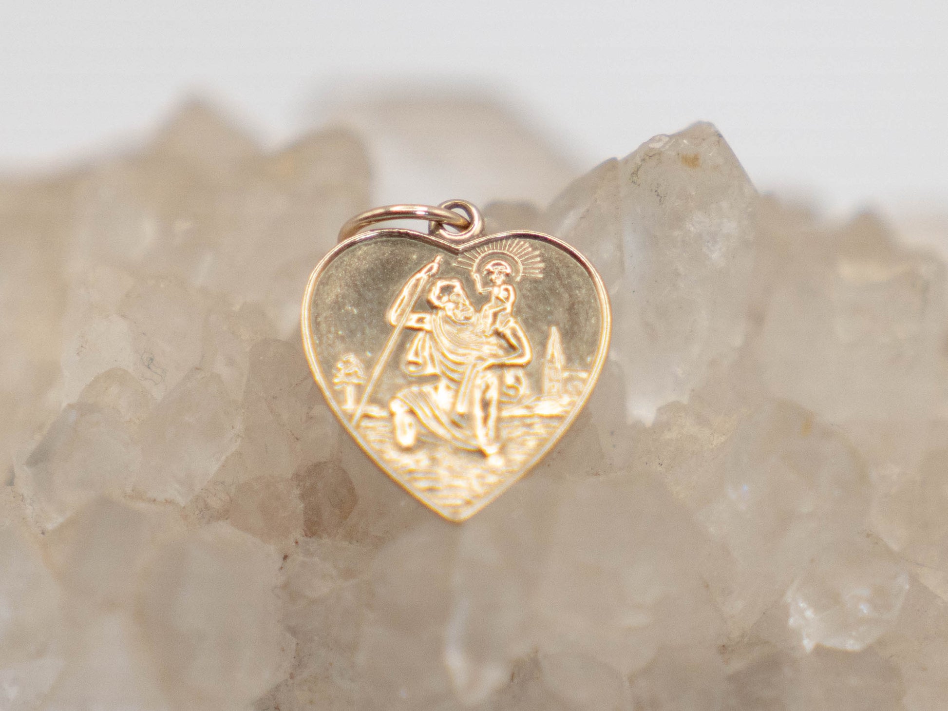 Gold heart pendant with a beautifully detailed St Christopher design. The St Christopher has long been a token of safe passage and divine protection for those on any kind of journey, with added symbolism of faith and courage. Transformed into a love talisman, this piece will protect you on your quest for true love - both love for yourself and in relationships with others. This talisman is particularly powerful if you are feeling weary or dispirited in your search for love - and perhaps also seeking to call in a future featuring international travel.