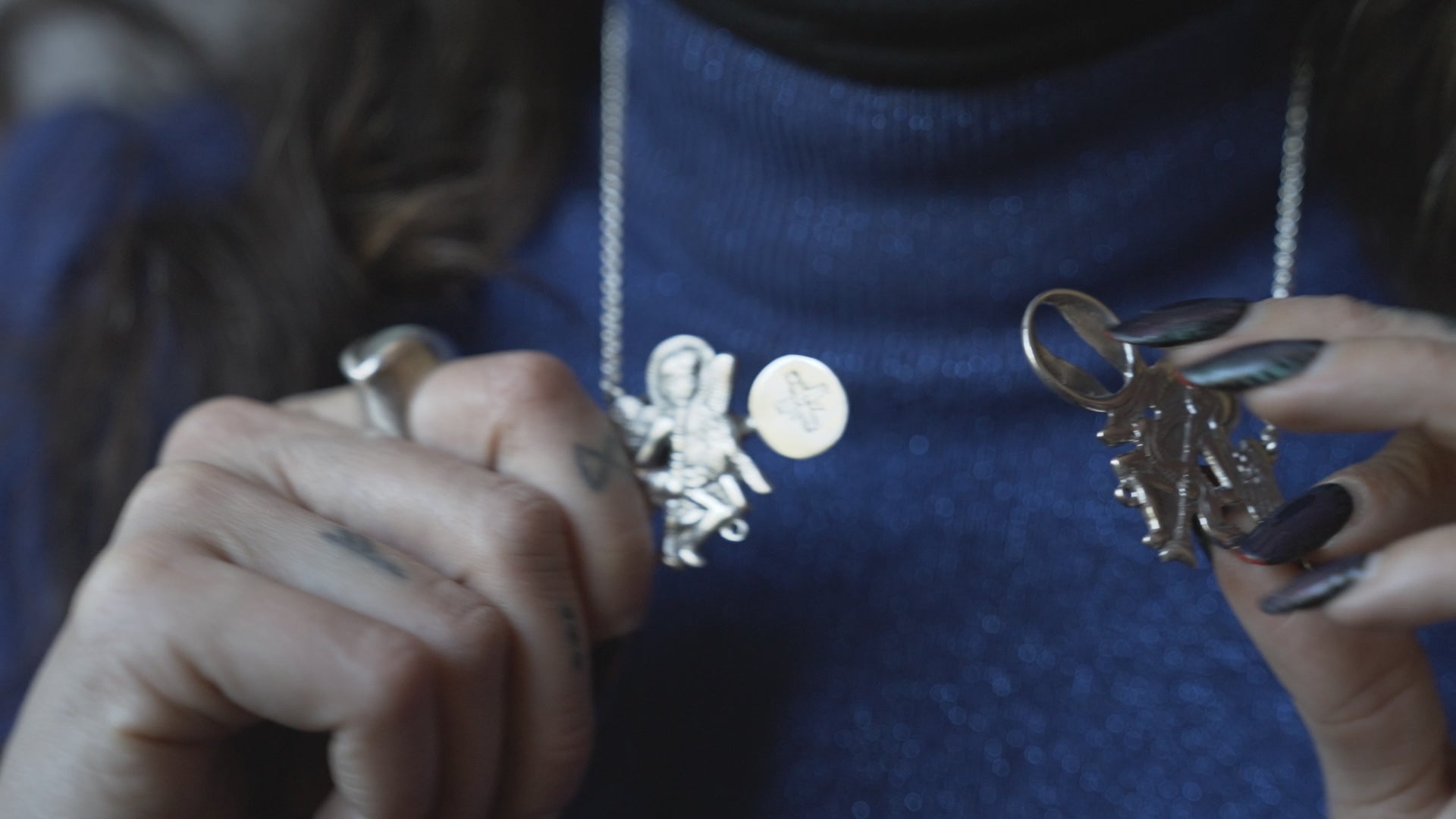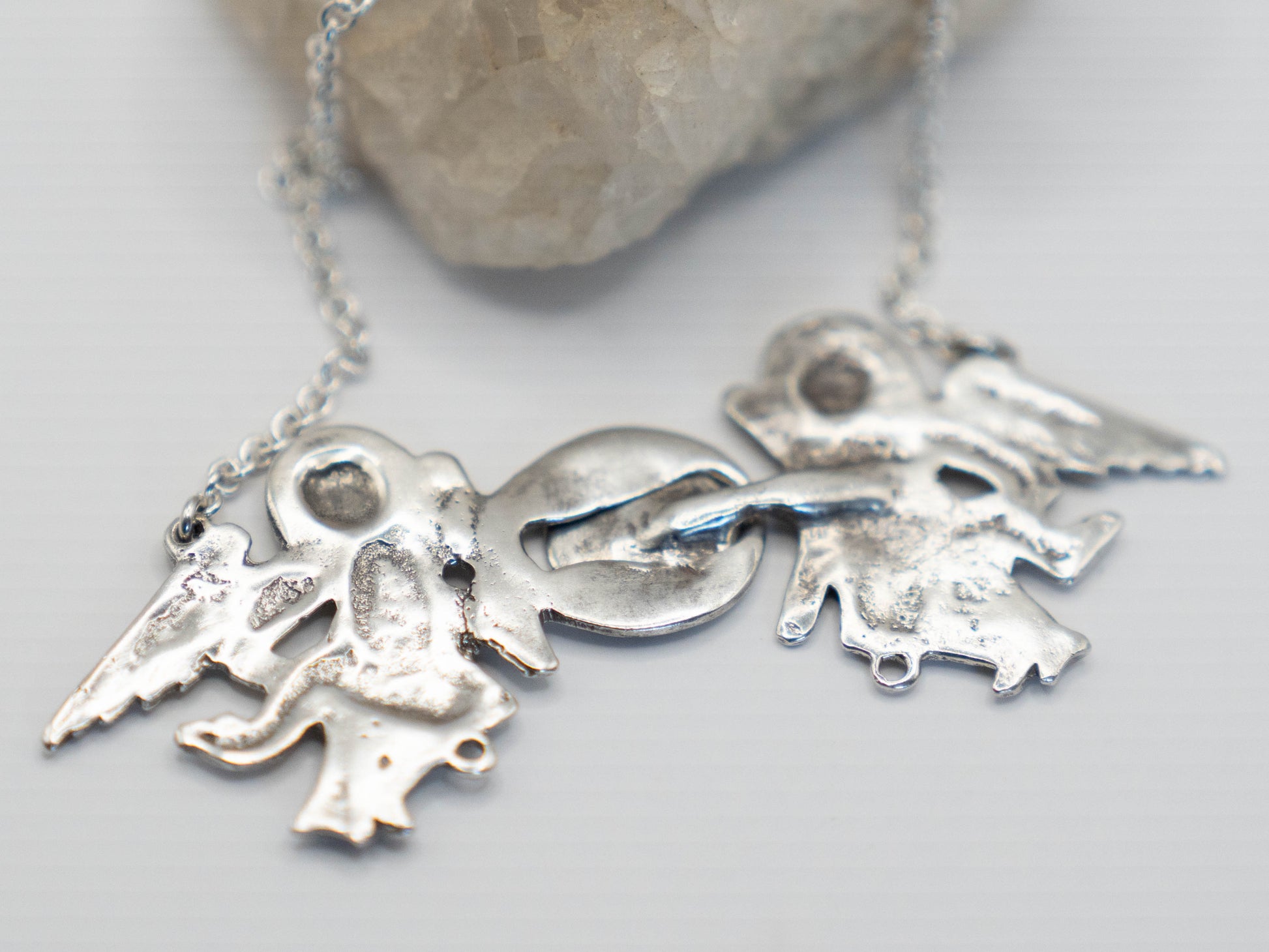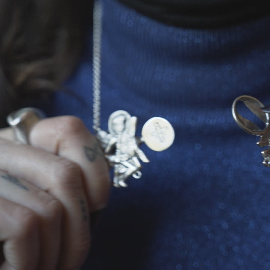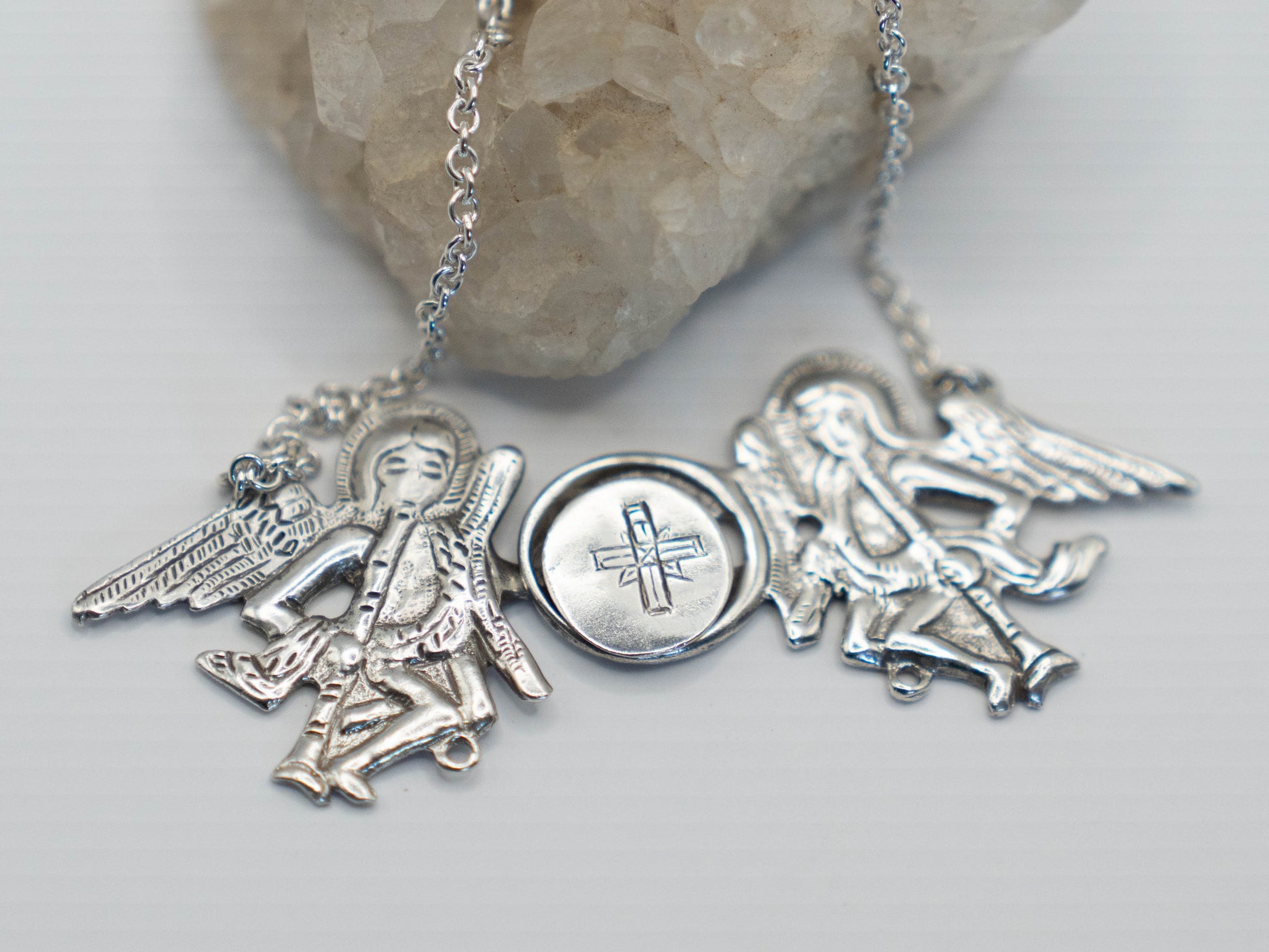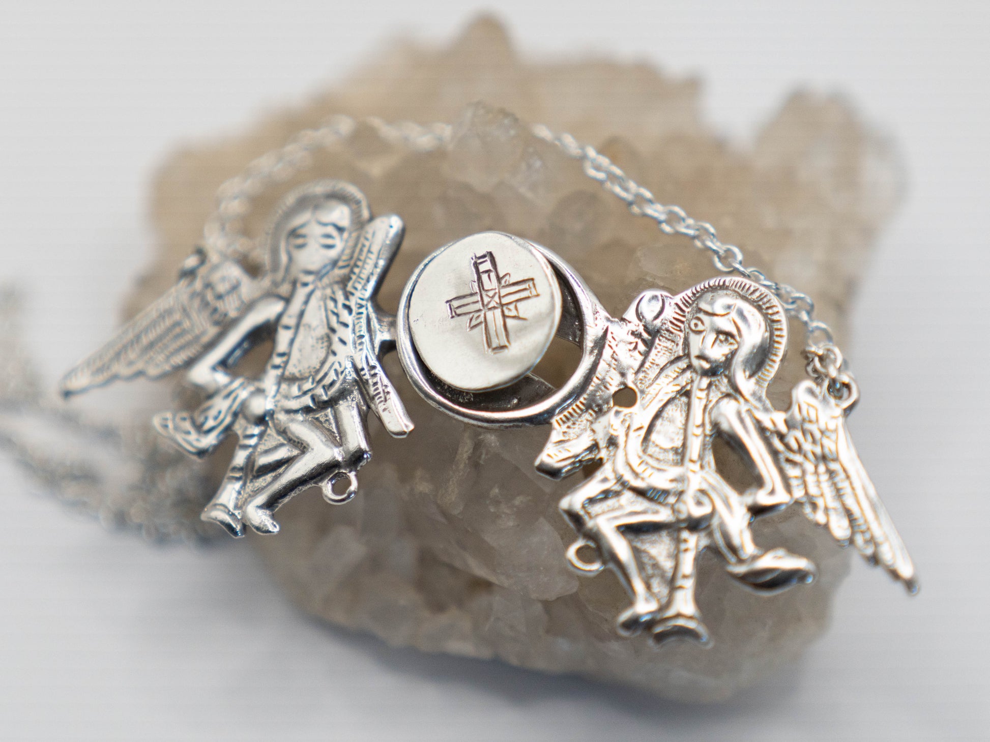 Two Seraphim come together, holding a cross; it might depict the host; the unleavened bread used in the Eucharist. In the Quran and the Jerusalem Bible, the ‘Heavenly Host’ refers the divine army of God that one may call upon for protection. This piece is one of a pair I found in Istanbul; I bought both and made them both into necklaces, before transforming them into true magical protection talismans.