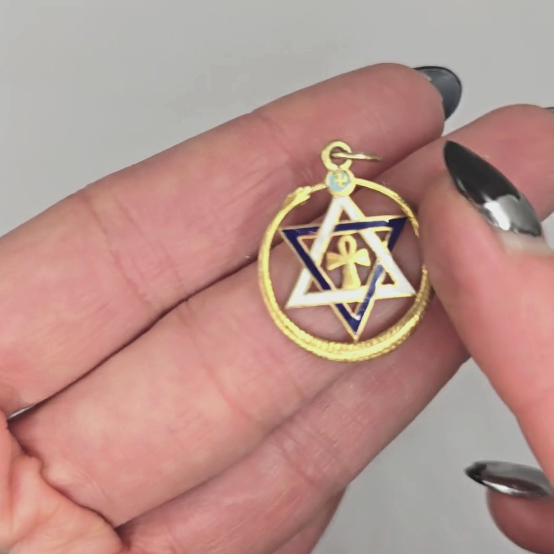 This Protection Talisman made from the emblem of the Theosophical Society is cast from 14ct gold and decorated with enamel. An incredibly rare piece, the emblem or seal of the Theosophical Society is composed of a number of symbols, all of them having been used from ancient times to express profound spiritual and philosophical concepts about humanity and the universe. Taken together as in the Society’s seal, they represent a unity of meaning, suggesting a vast evolutionary scheme embracing the whole of nature, physical and spiritual. Study and contemplation of the emblem as well as its several component symbols will lead the serious student to an awareness of some of the deepest mysteries of existence.